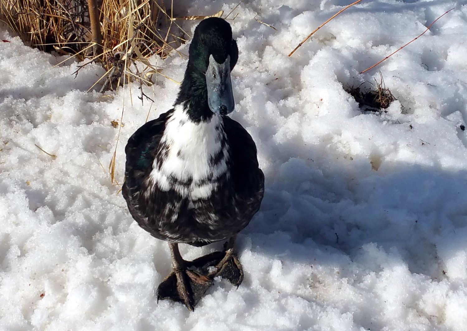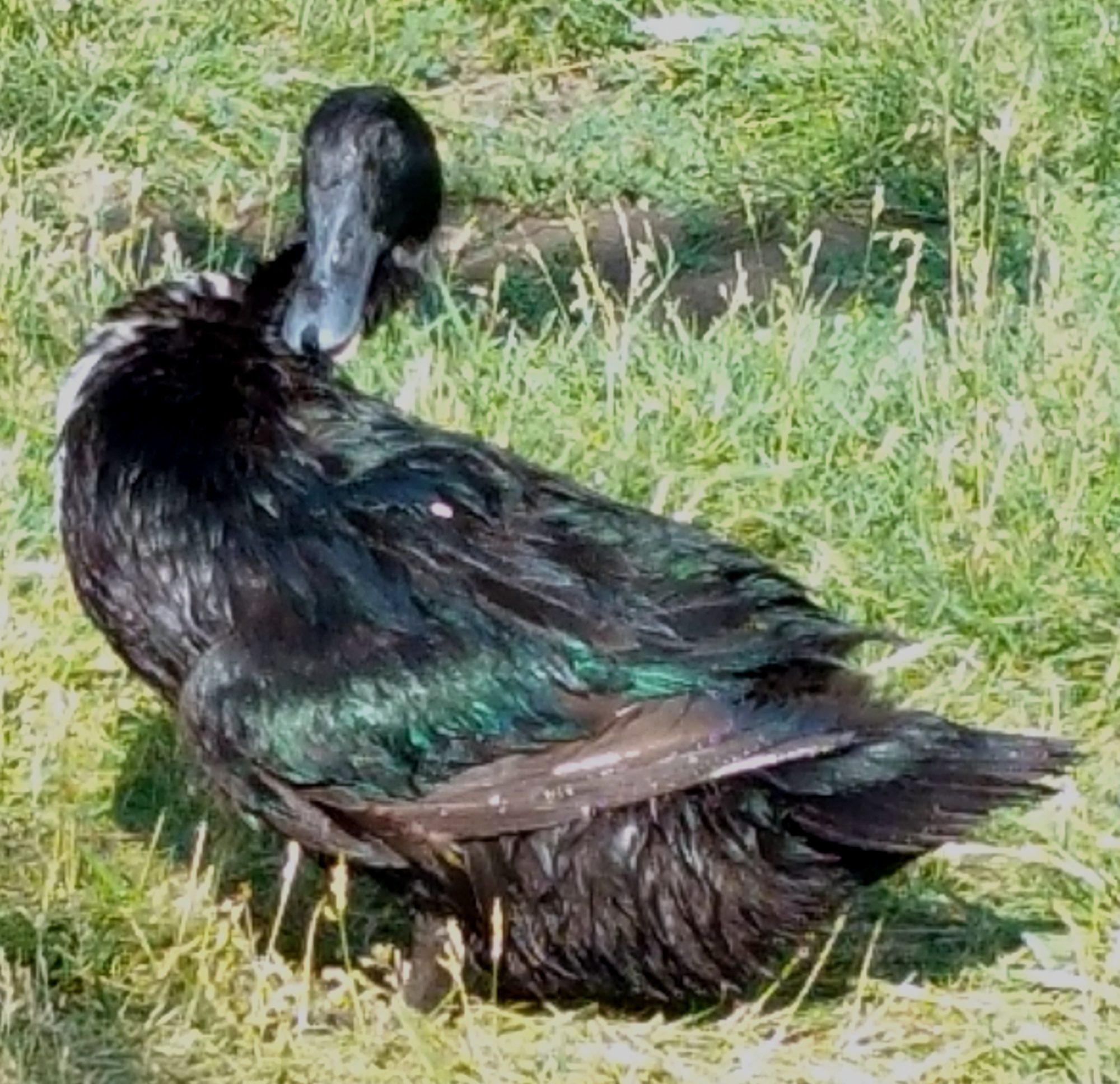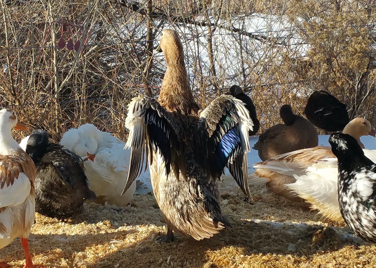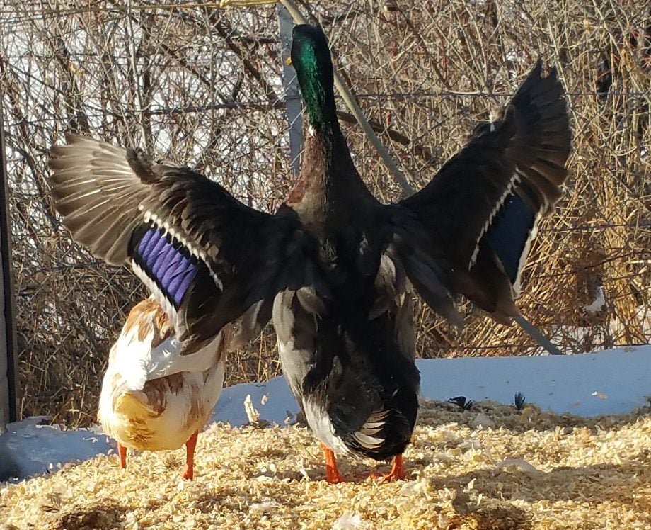 Think you might be right though Dan. (I didn't notice that earlier) The birds in question look like they have the white bars above and below the speculum feathers. My black Swede does have white wing tips, but they are just that the leading edge of the tip of the last flight feather is white. Also my black Swede has completely black feet which I think is normal. My Blue Swede has orange and blue blotches, but my black one's feet look the same as my Cayuga. Their bib is much nicer and more uniform than my black Swede's though, I'm jealous of thatNope, doesn't bother me at all. Pretty aren't they? Wish mine looked like that.![]()