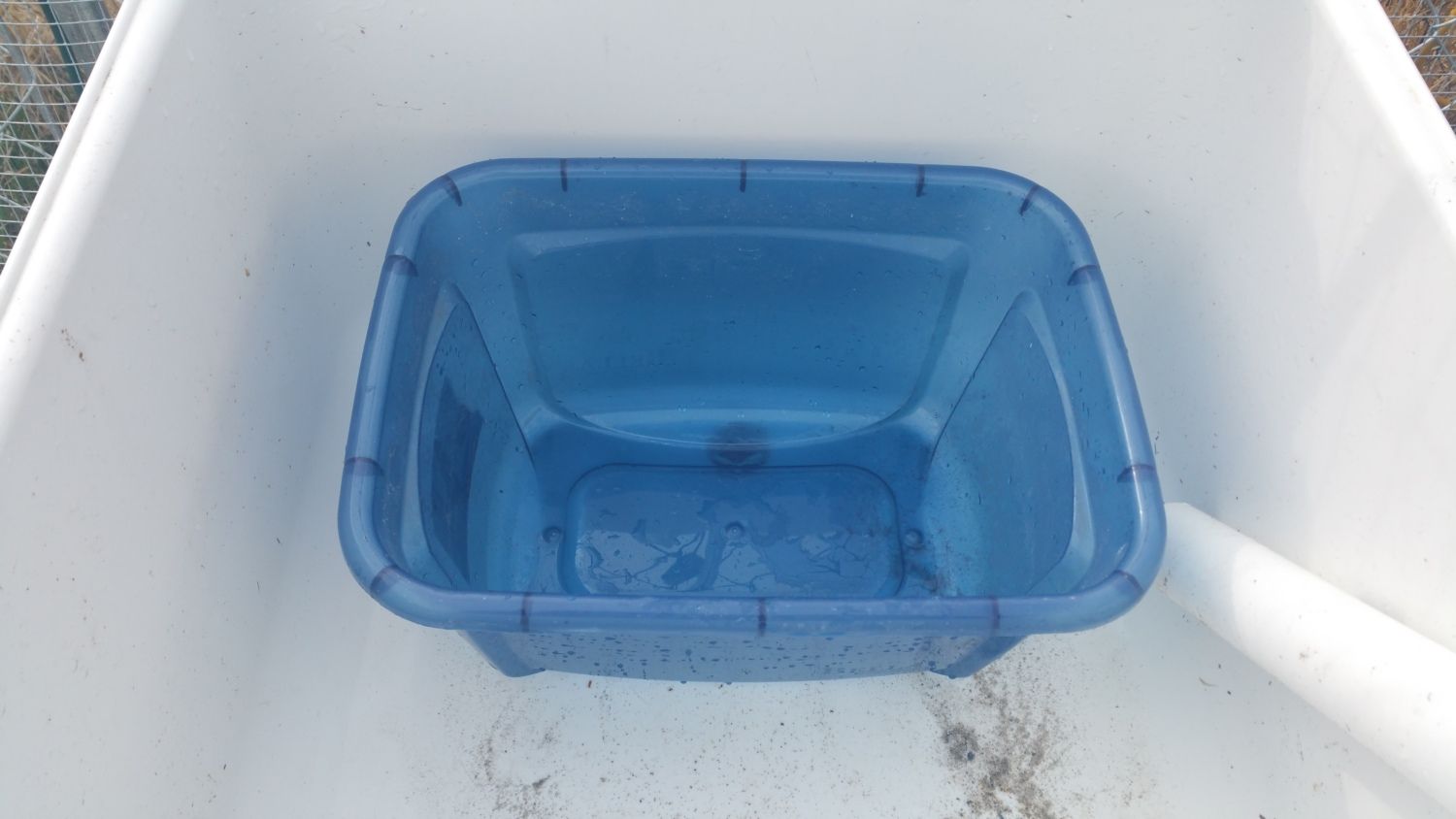 First, pick a large container that you would use if you weren't afraid of them using it as a mini bathtub. In this case I'm using a 3 gallon storage box. I have used buckets / large dog bowls and many other things.