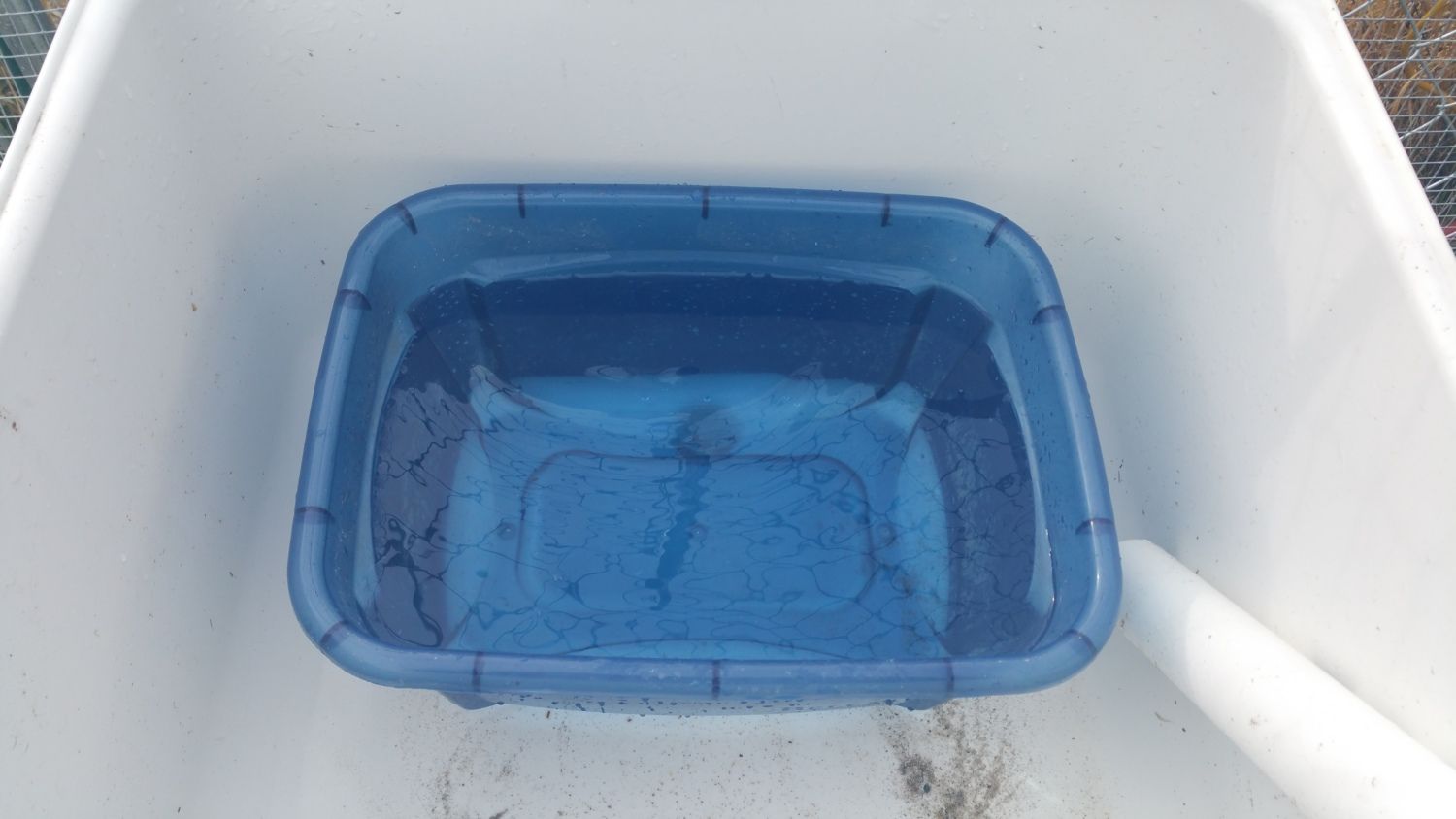 In a couple different threads recently, I've seen some discussion on what a duck needs for a drinker. Unfortunately the world doesn't (AFAIK) make drinkers for ducks which allow them to wash their eyes easily. So I'm going to post this little makeshift idea that has temporarily worked for about 3 years (and outlasted several containers.)