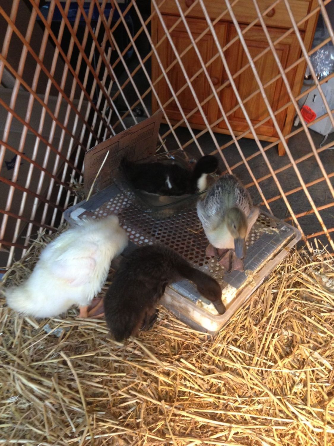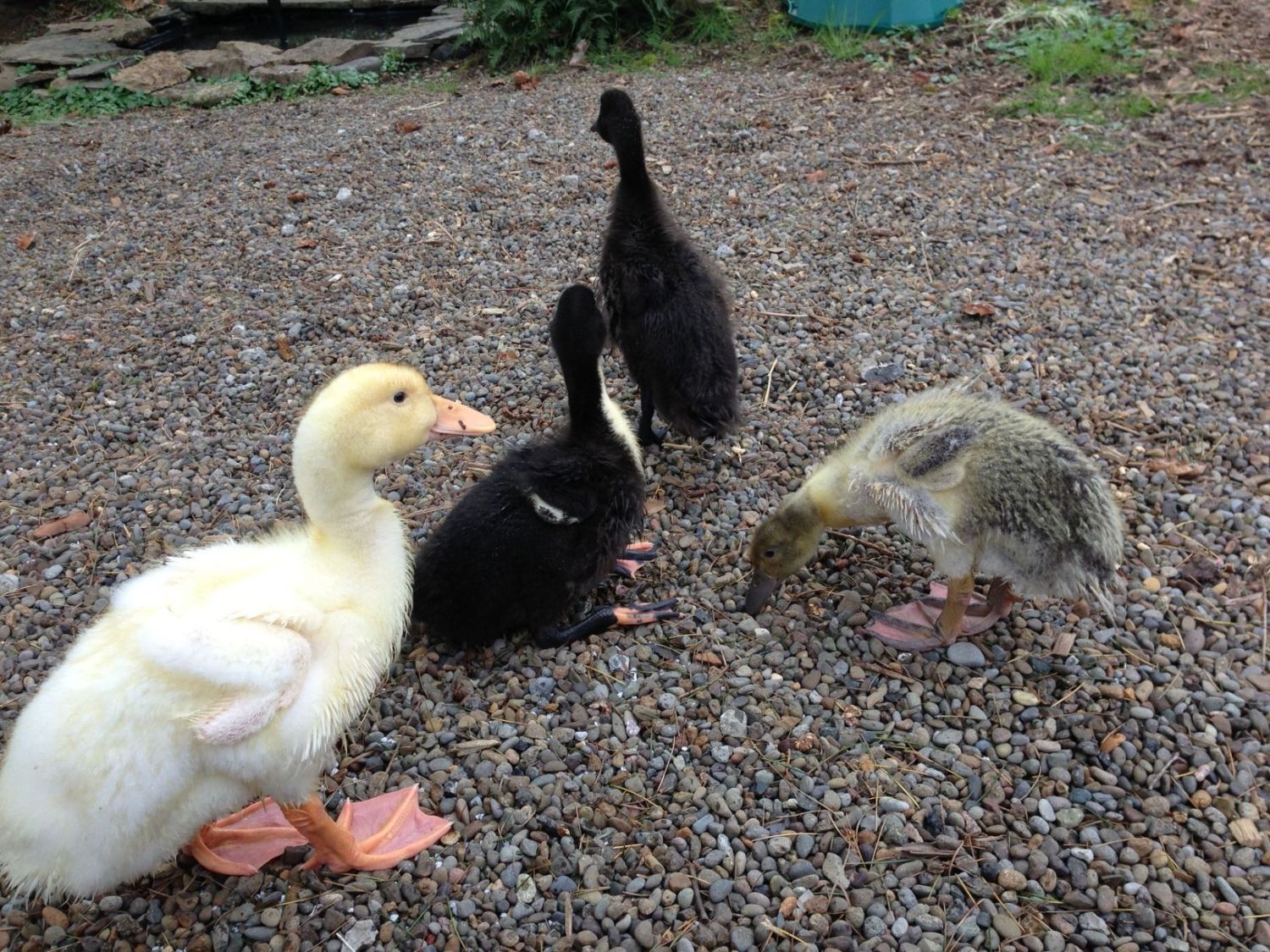 I just bought my first house and it came with a chicken coop! For obvious reasons my SO and I chose ducks over chickens, and thus the experiment with 4 wildly entertaining ducklings has ensued. We bought four hens: a Pekin (Grace), Cayuga (Martha), Welsh Harlequin (Piper), and Black Swedish (Juniper/June). It's been super fun thus far and we're both in love with our ducklings. They're about 3.5 weeks old at this point and are really starting to feather, especially on their chest and wings.