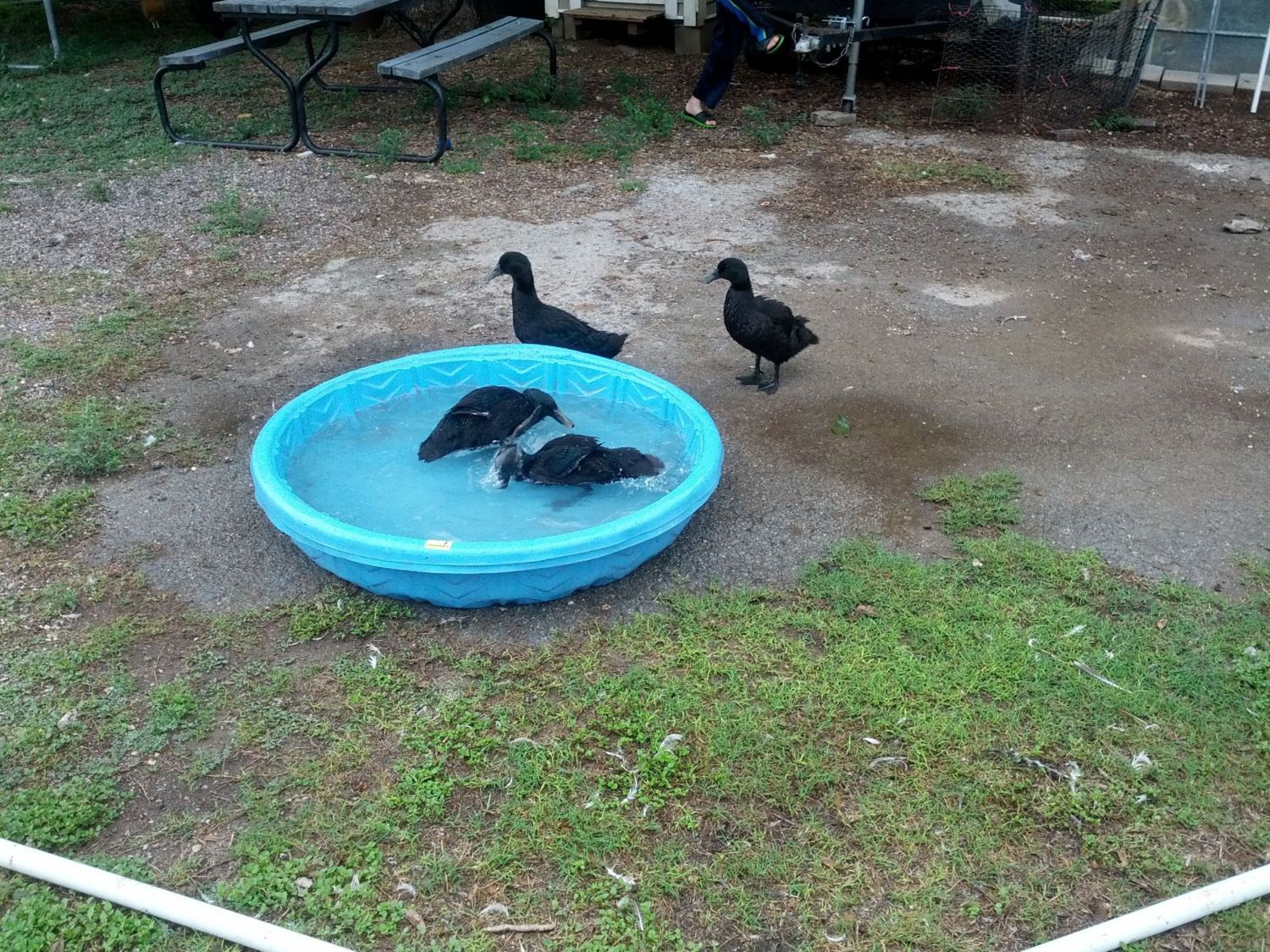 Here are my Cayuga ducklings enjoying their pools. They are so big! The are starting to integrate with my 3 older ducks, but the 4 Cayugas always stay together where ever they go. It's too cute.
