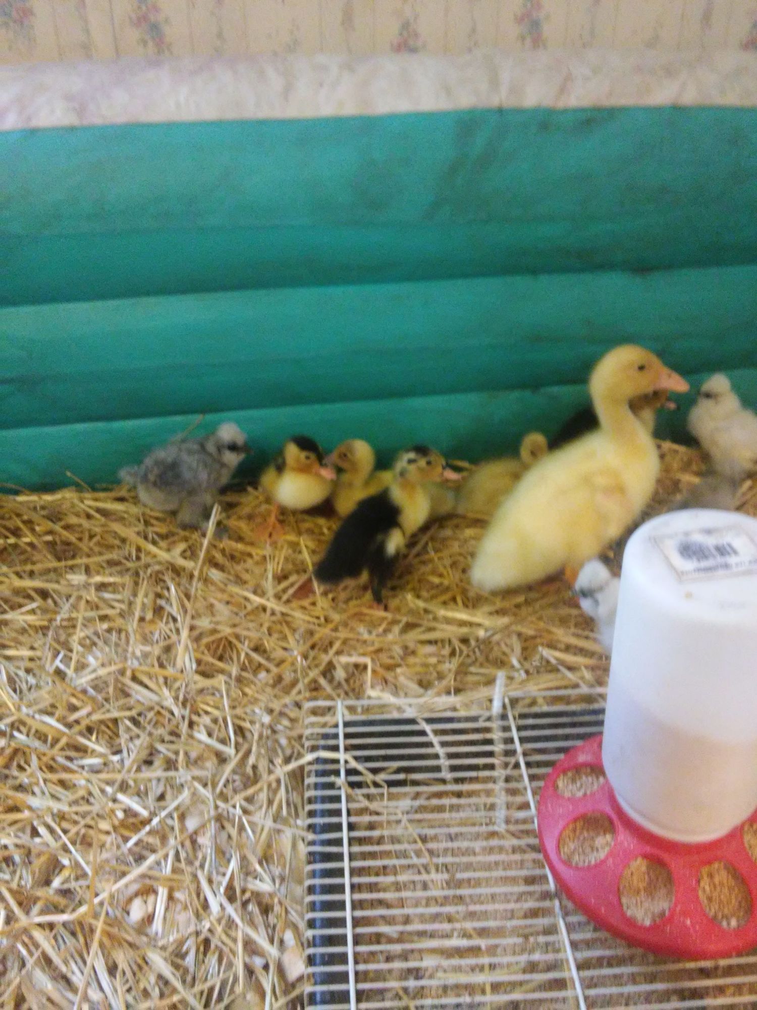 Our baby ducklings (and silkies). Ducky surprise is 2 weeks old and we think a pekin mix. It hatched from an egg our friend gave us that we thought was a chicken egg. We also have 2 buff females, 2 magpie females and 1 magpie male that are 1 week old.