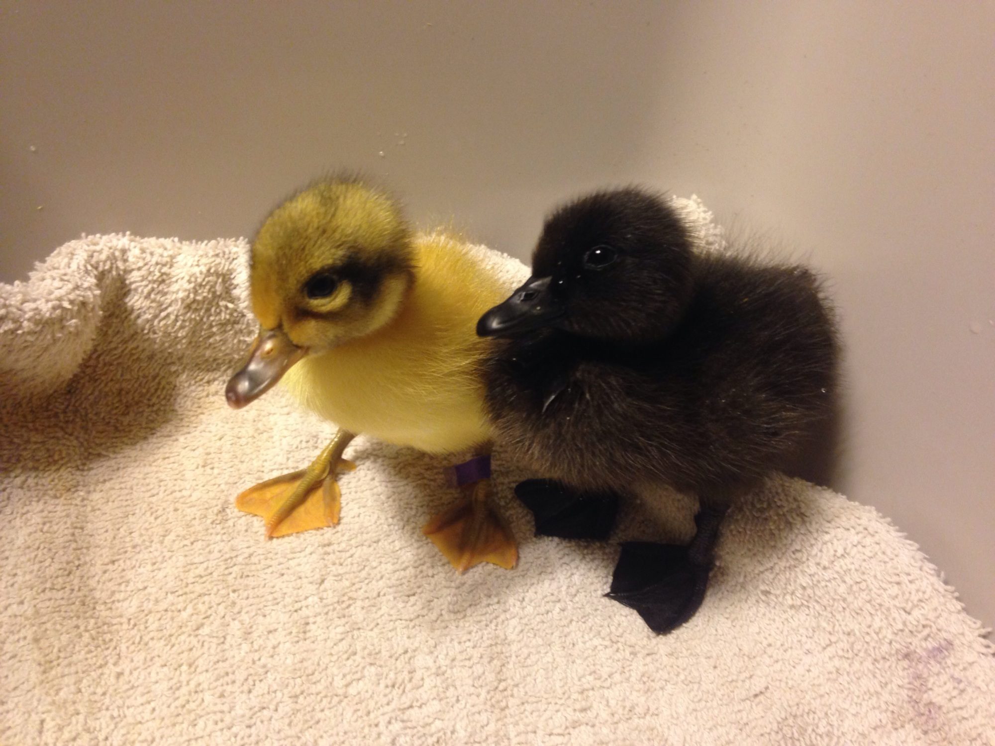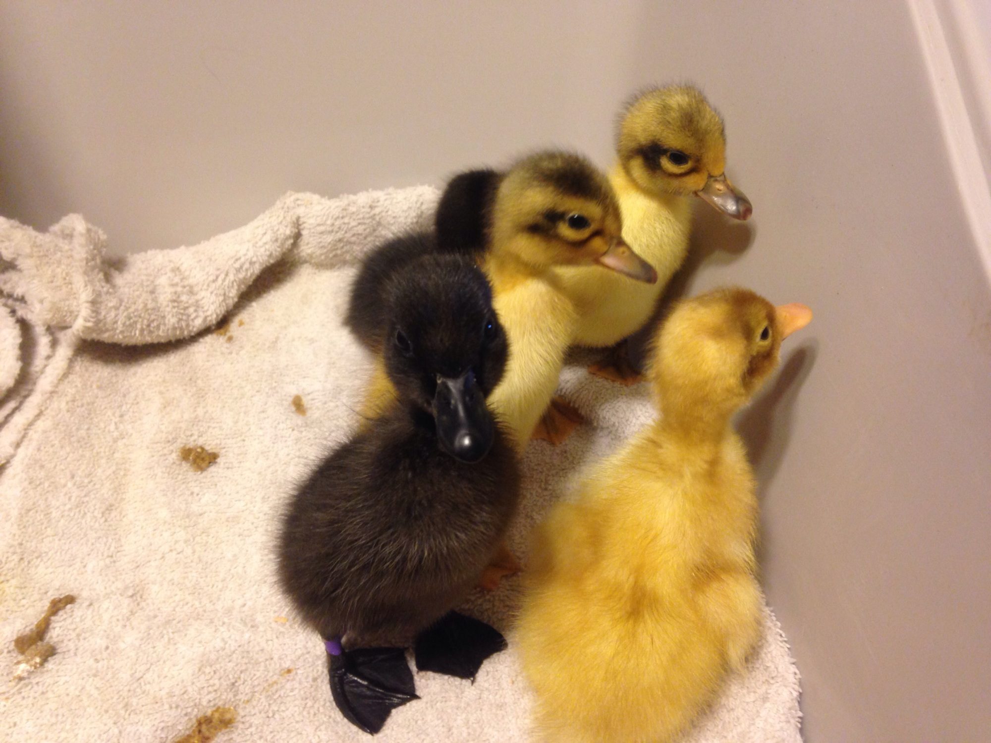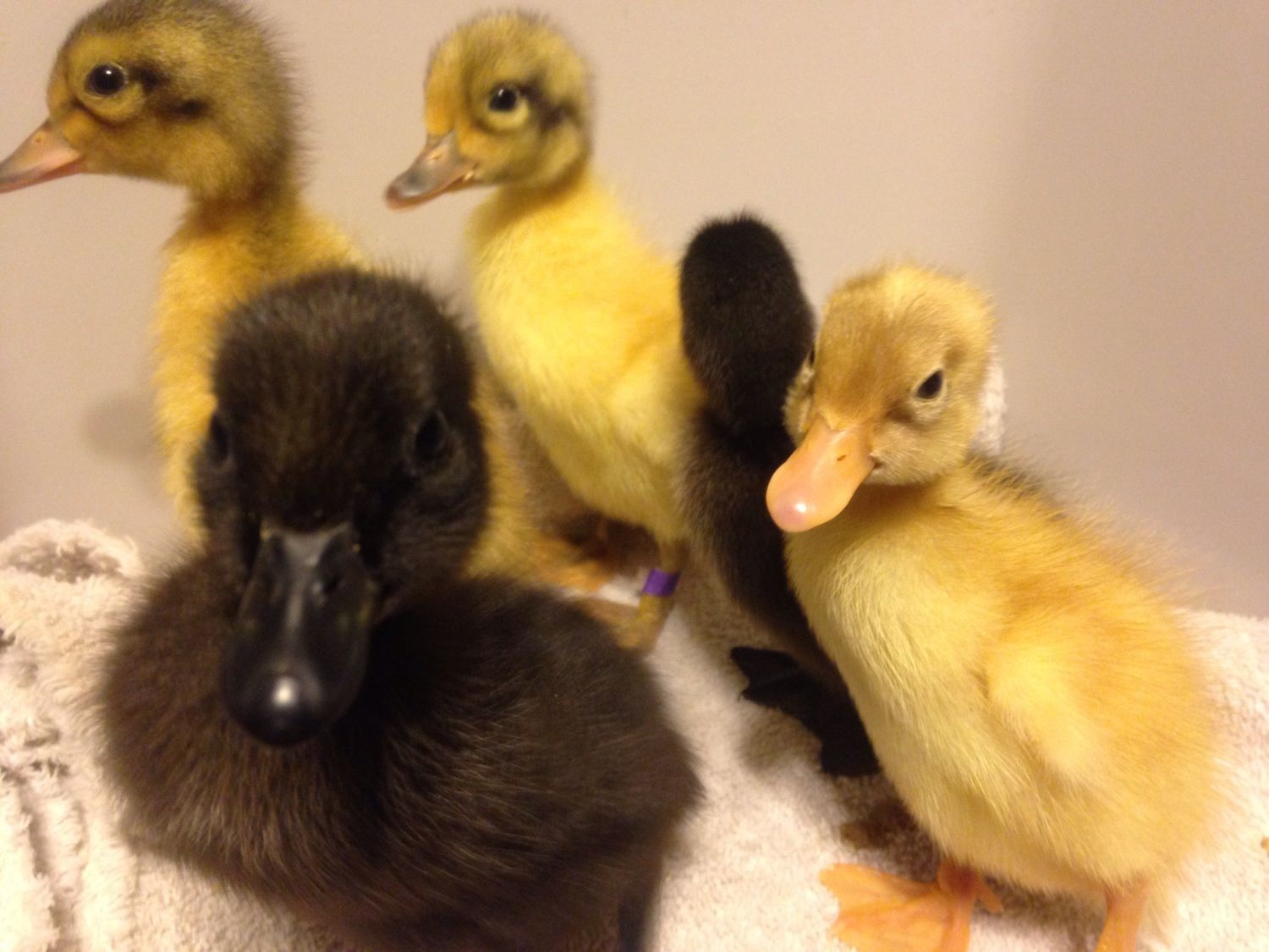 Two WH's, two Cayugas and a runner. Sadly, the buff I ordered was DOA, so Mezter is replacing it, and I ordered a blue Swedish to travel with her in the beginning of March. There appears to be something wrong with the runner's left leg, but she's been eating and drinking. I think it happened during the shipping process because she came that way, and I don't thinm Metzer would have shipped a lame duckling. I hope the little thing makes it, because my fiancé loves it already. He named it Duckasaurus.