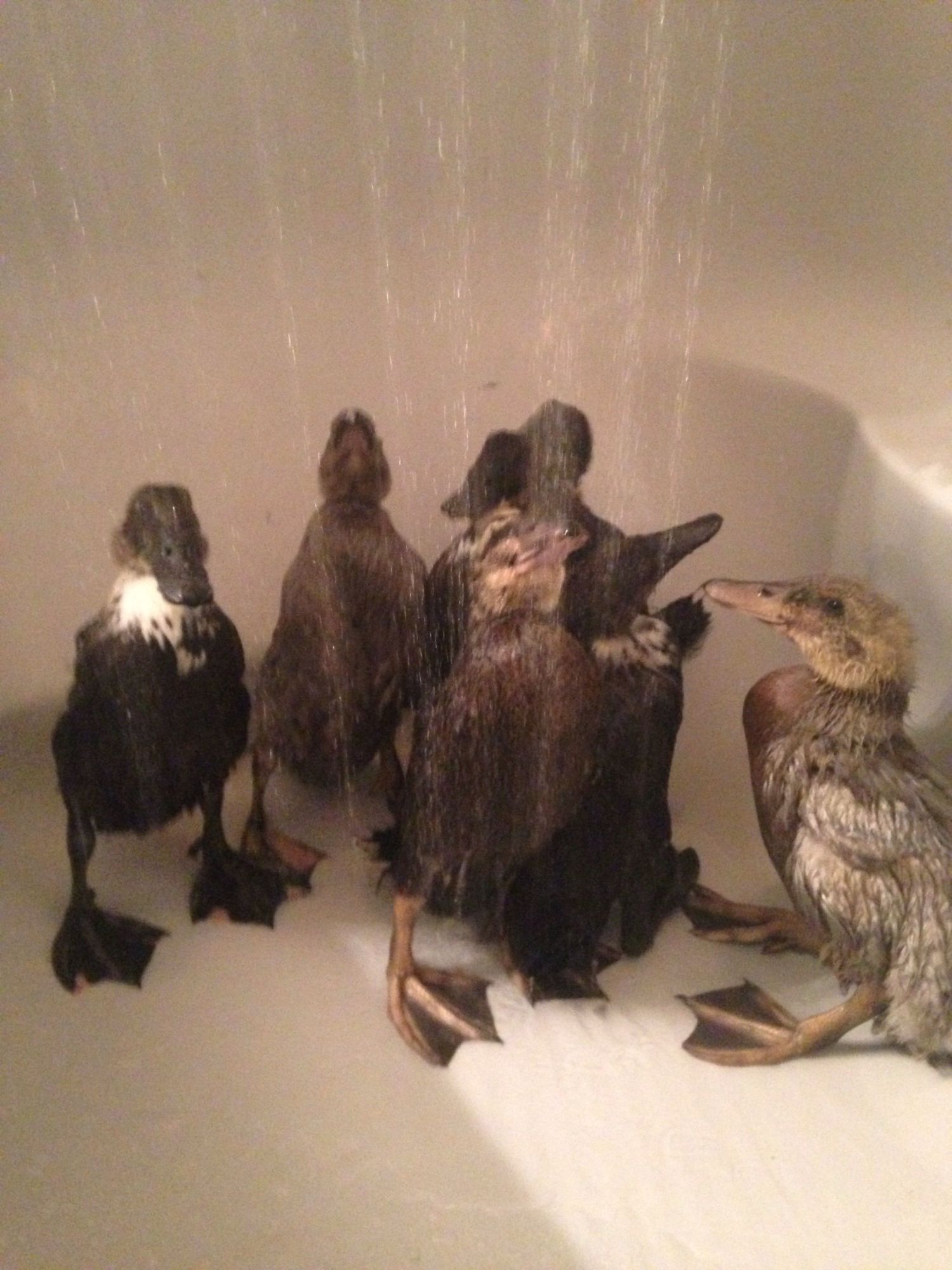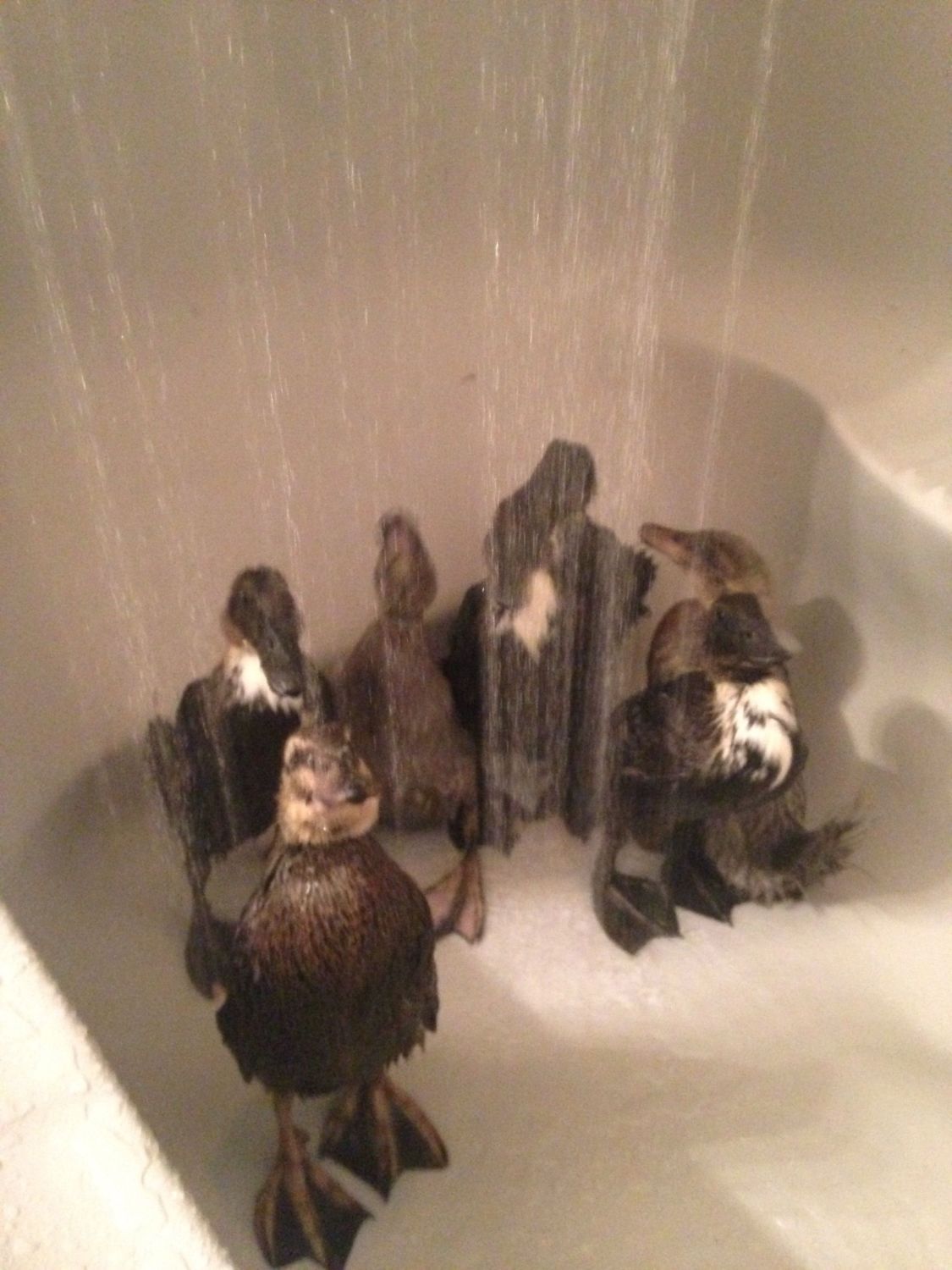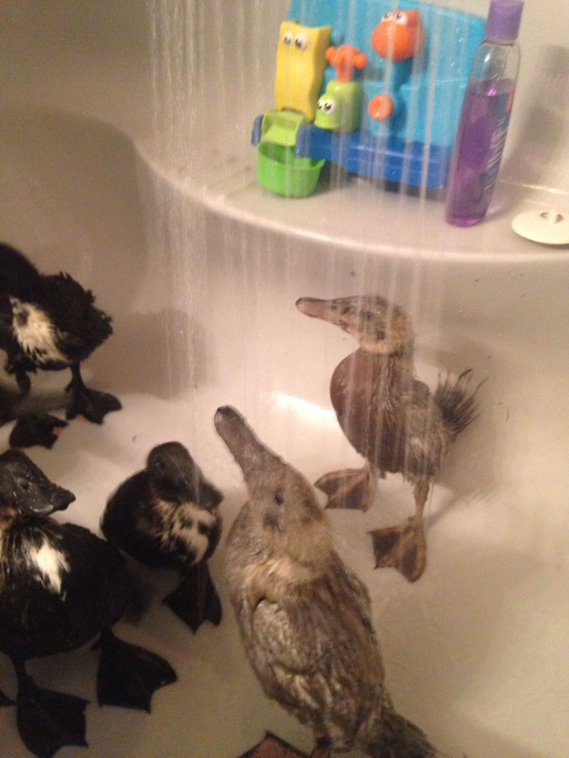 So freakin adorable! My Dear Husband found this out. We try to get them into the bath each night, since they were one week old. He gets to bathe them while I clean & prep the brooder for the night. I went in two nights ago and he had the shower going on them. They loved it!
