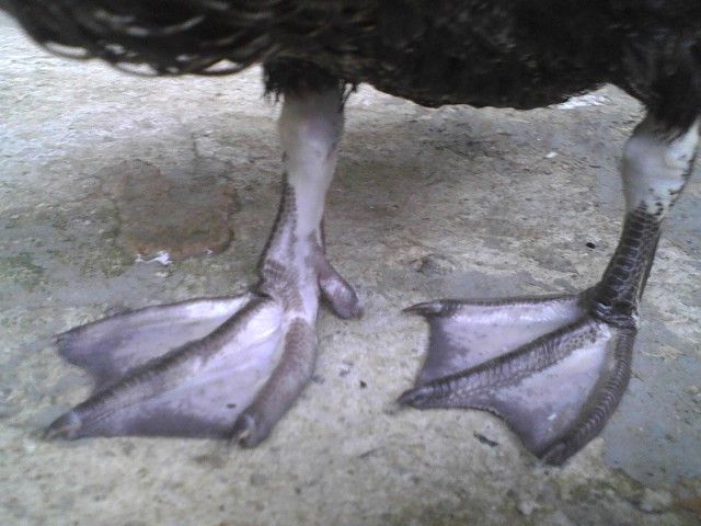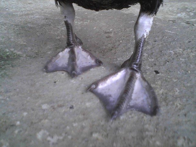 its webbed feet have white-ish and something and on its knees it has yellow stuff
