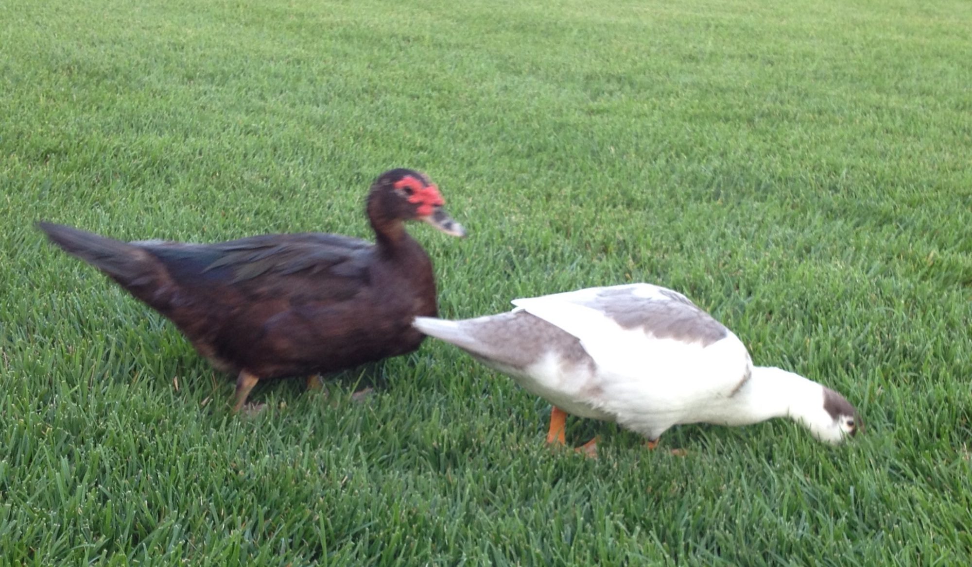These are my neighbors mallard mutt/Muscovy cross ducklings. They were born June 8. It's killing me that the rules of sexing seem thrown out the window. Any guesses on male or female? The brown one seems to have mom's little head, but the white one looks like jug headed dad.