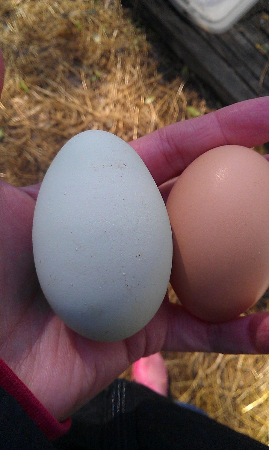 I got a egg and it is huge! I went together eggs yesterday and thought that looks green. I got out in better light and low and behold it is and what a whopper. I think it came from Strawberry my oldest EE. When I got her over a month ago The man said she laid olive green eggs. This is more mint green to me, but I'm happy.