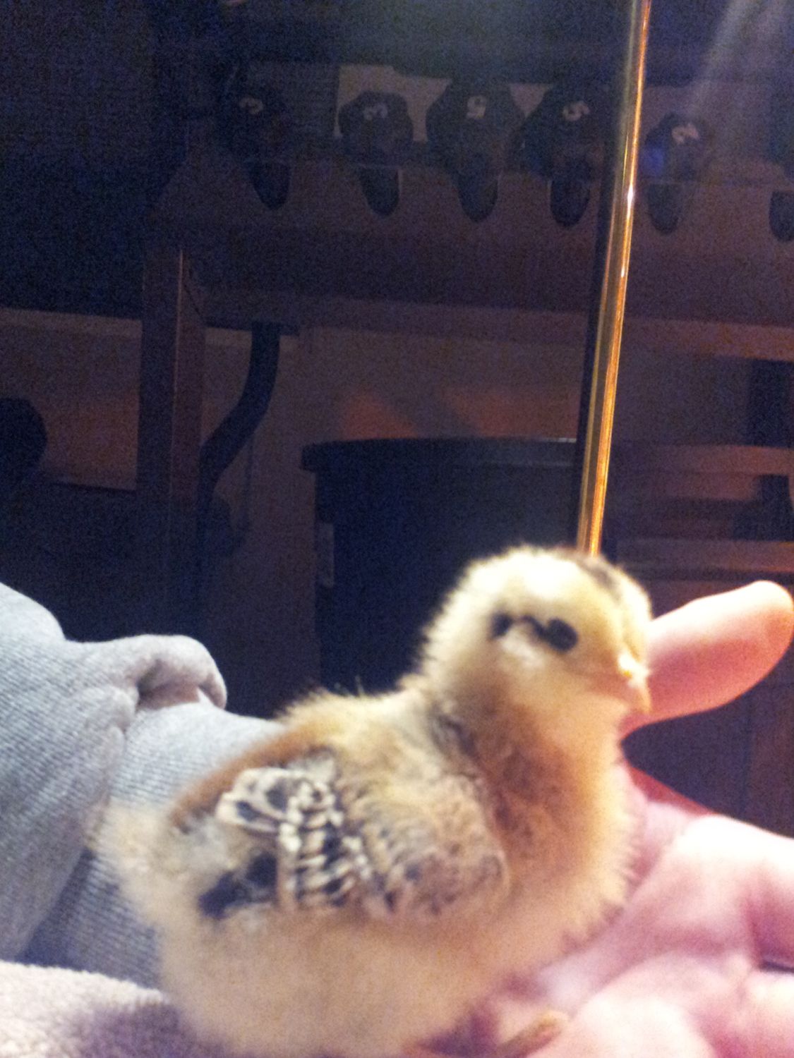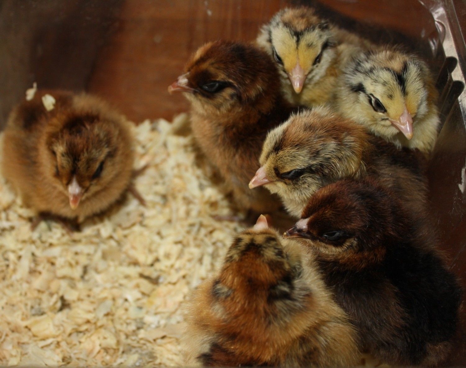 35 EE & OE hatched ;-) such cute little buggers! These are from 6 different hens, 3 EE girls, 2 Welsummers and 1 Wellie/leghorn cross, and my Red roo. His coloration is very similar to a Welsummer. Lots of chipmunk stripes and some wild eyeliner going on. Some with smooth faces and some with huge cheek puffs. All very cute. Will get some more closeups tomorrow
