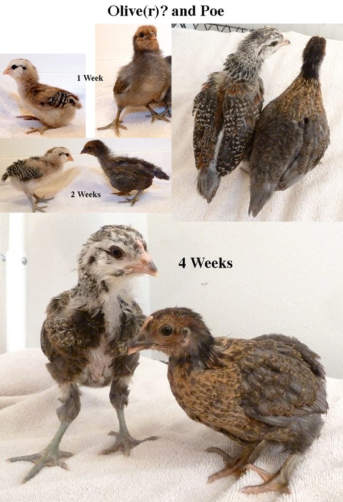 These two still have me guessing. Olive just started acting and looking more like an Oliver in the past couple of days, and Poe seems like a girl, but the comb has me unsure as well. Her coloring and stance seems pullet to me thought.