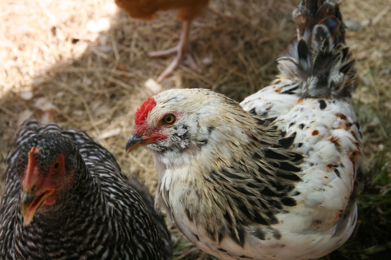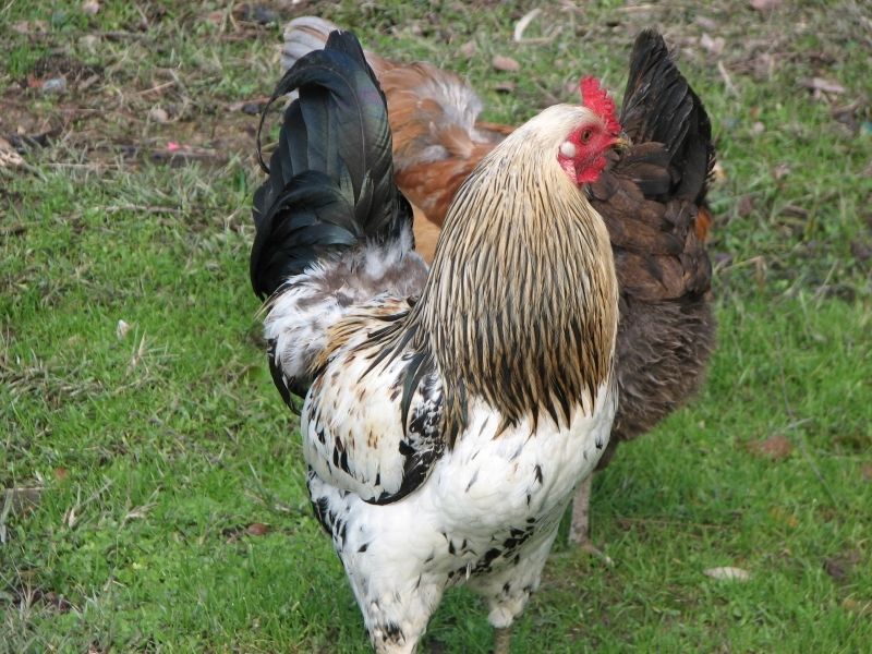 They are both beautiful, but I LOVE the black and white one. How old are they in the picture? I have an 11 wk old I am hoping and praying is a girl, but she is rumpless so I don't have tail feathers to help sex, and the hackle feathers on EE's all seem to be pointed. She was a "sexed" pullet from the feed store, too .......