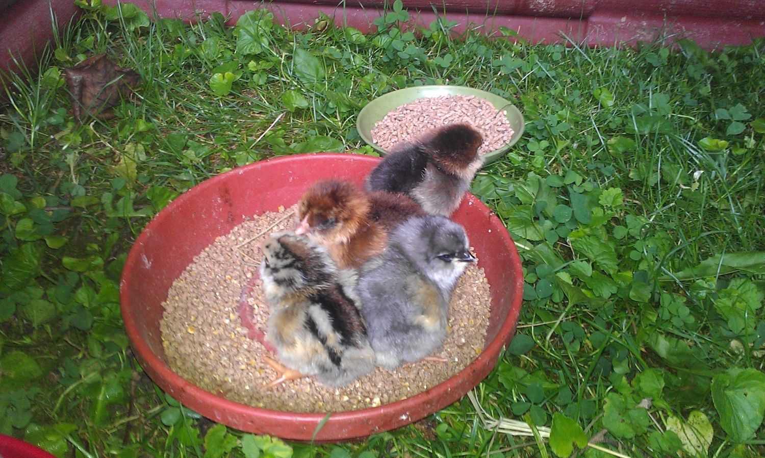 Look at the fuzzy faces I had hatch Sunday. Roo would be one of my Non Standard Ameraucana Hens One egg from each EE, Australorp, Silver Laced Wyndotte, and Brown Leghorn. Want to guess which came form which. lol All have very puffy cheeks.