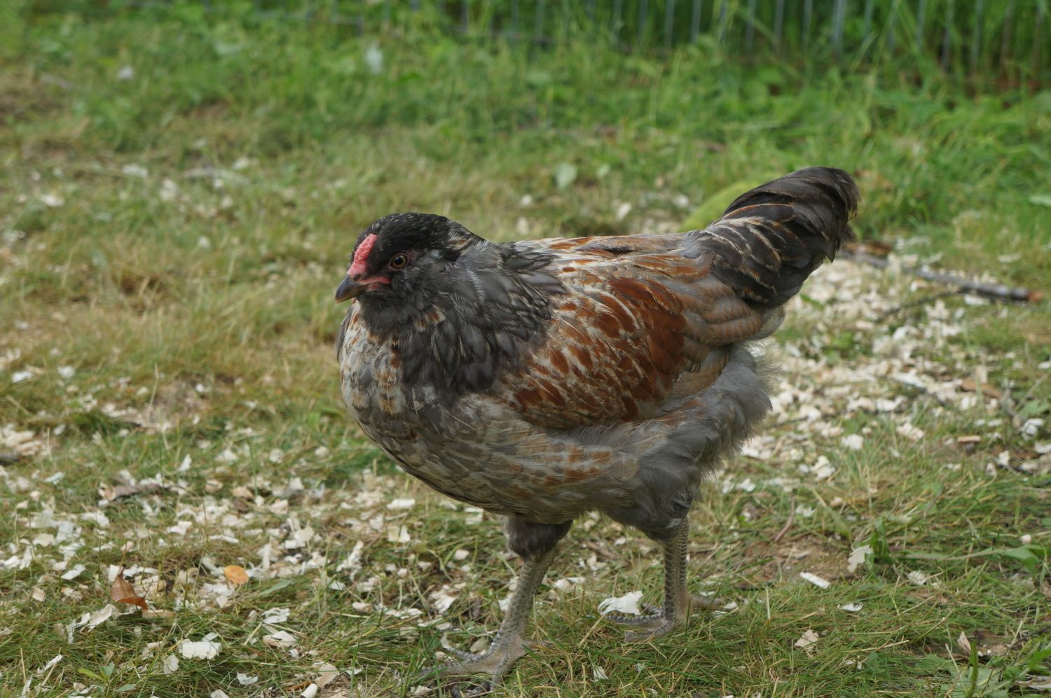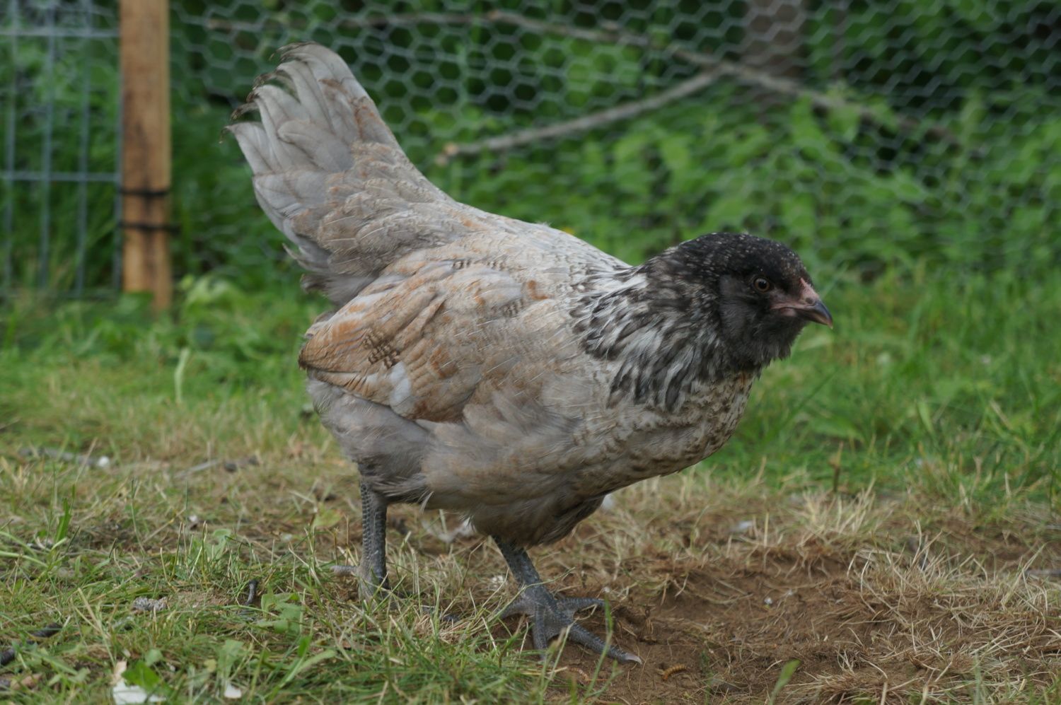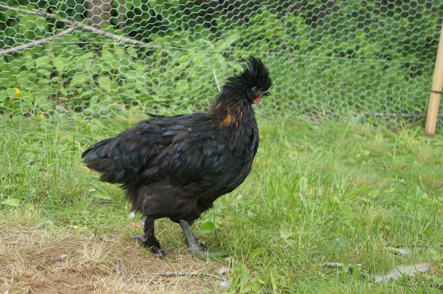 after the blunder of getting more roosters when i wanted pullets, i ventured out to a different source and got 5 more 15 week old. i did get a third rooster, but i just couldnt resist him. hes a silkie/muran mix i believe. i call him afro chicken.