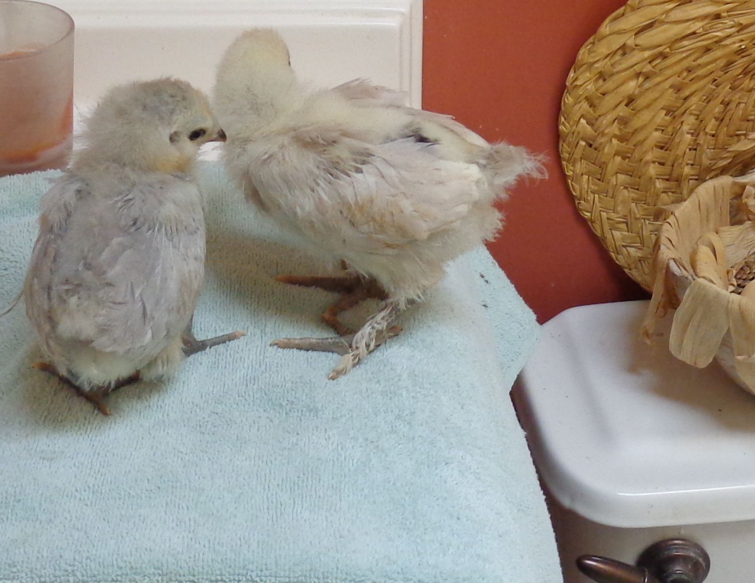 These are my not so Traditional EEs they will have straight combs and no beard or muffs, Though they do have feathered legs and may develop a crest. These chicks are a cross between a Crested Cream Legbar Rooster x Silver Laced Cochin Hen. They are 3 1/2 weeks old now but only 2 weeks in the pics