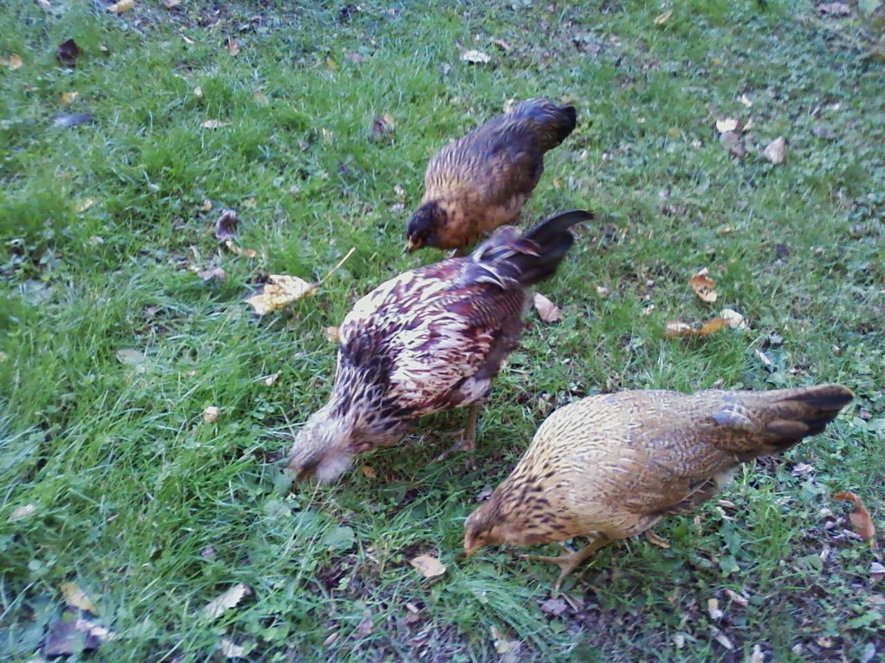 Thanks for the info. Here is a picture of my three ten week old EE's. Opinions? The two on the sides both looked like chipmonks although one was darker than the other. Still is. The middle one was speckled (really stunning looking) and slightly larger than the others.