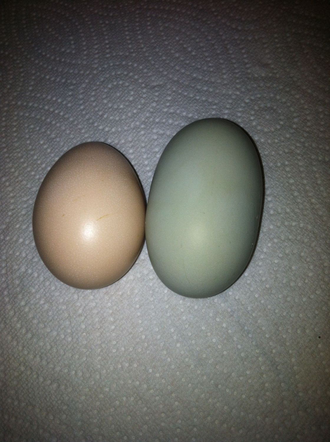 My EE pullets are starting to lay at 24 weeks. I just found an egg from a second layer today! The strange looking oblong egg is the newest layer's egg. Now I have a pink and blue layer! :)