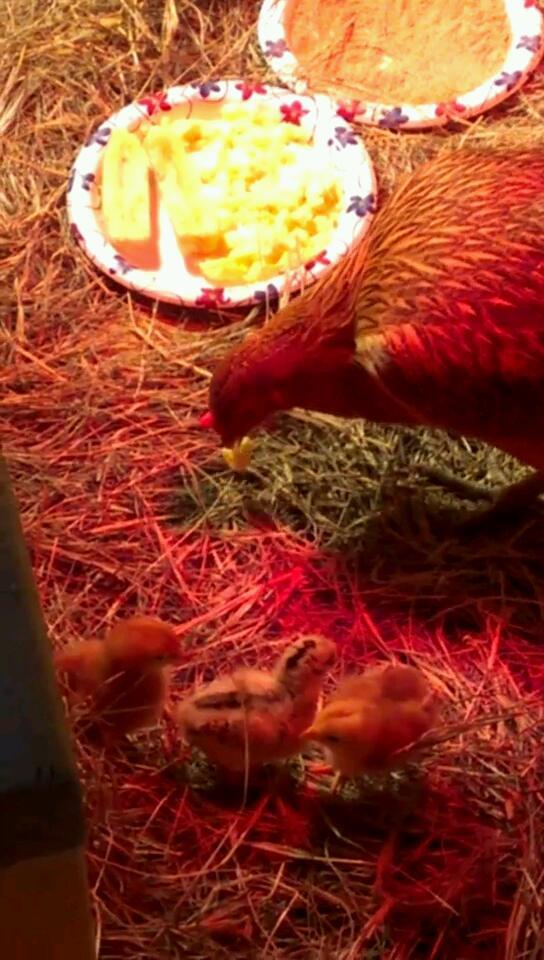 EE hen did great. Brought them a plate of scrambled eggs and garlic with some fresh oregano sauteed inwhile I snarf down a a few bites on my way out to them I grab a banana from our ripe pile for them (shoot we were having cereal and the house smells amazing