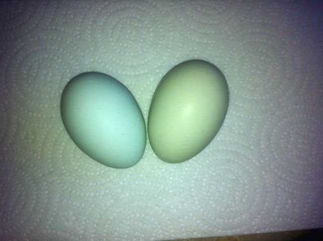 Hi EE people, I've got a question, sort of. More of a curiosity. I'm coming to the end of my first full year as a chicken owner. My three EE's, who hatched late March 2013 started laying in August 2013. I got a plentiful supply of light green eggs from them for the next two months. The thing was, I could have sworn the very first egg I collected was blue. Course, I ate it, and didn't have it to compare later on, so decided I must have had a color blind moment, because all of the other eggs I got from them were green. Now, hurray! They have started laying again. I collected their first two eggs today. And, here they are:Sorry the picture isn't the best, it was getting dark out by the time I got home. But the egg on the left is blue. I had thought that EE's didn't change the color of egg they laid? I mean, I've heard the shade can lighten as the season progresses, but they don't switch colors completely? I'm trying to figure this out, and I'll see what happens as the year goes by. Could the brown color gene possibly be turned 'off' at this stage, and turn 'on' later? Anybody out there have some good egg color knowledge to share? And just for the fun of it, here are the two must likely creators of the above eggs, pictures taken last summer: