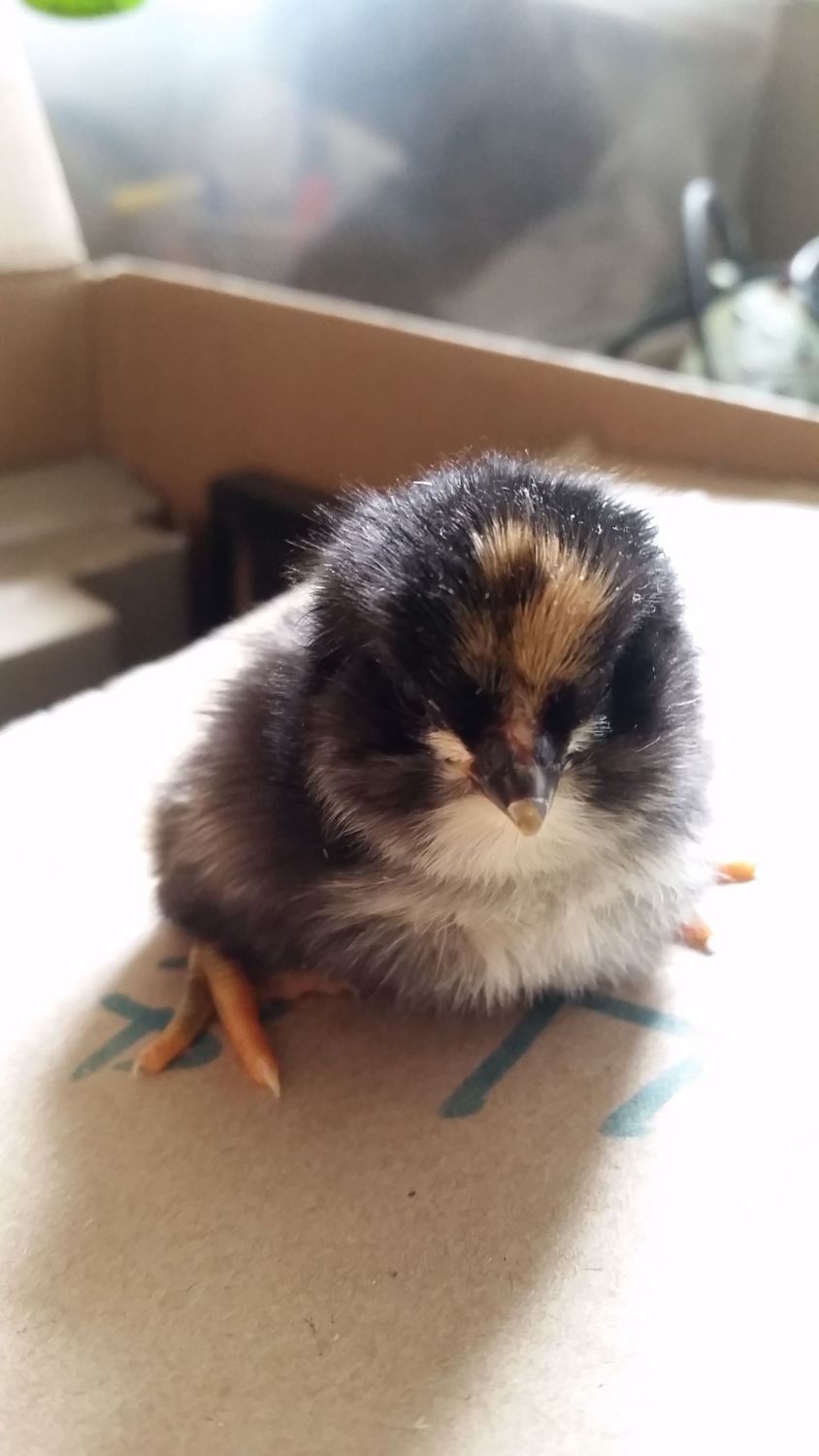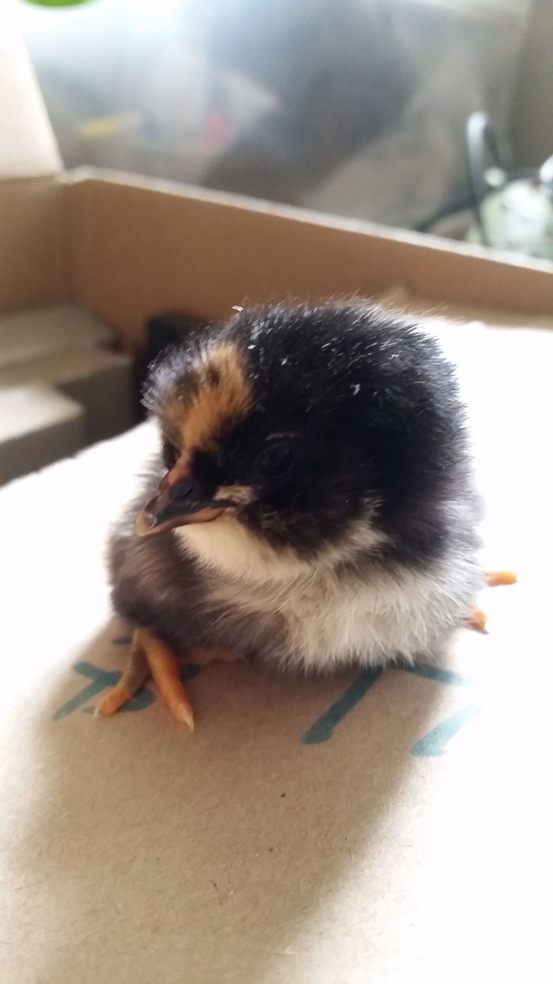 I just hatched out some easter egger chicks from my flock and I have the most curious looking little chick. It has an Easter Egger daddy and either a black Australorp or barred rock mommy. I think it may be a sex-link male and the mom is the barred rock...but the spot is not white it's buff, and the placement is not right. Has anyone seen anything like it?