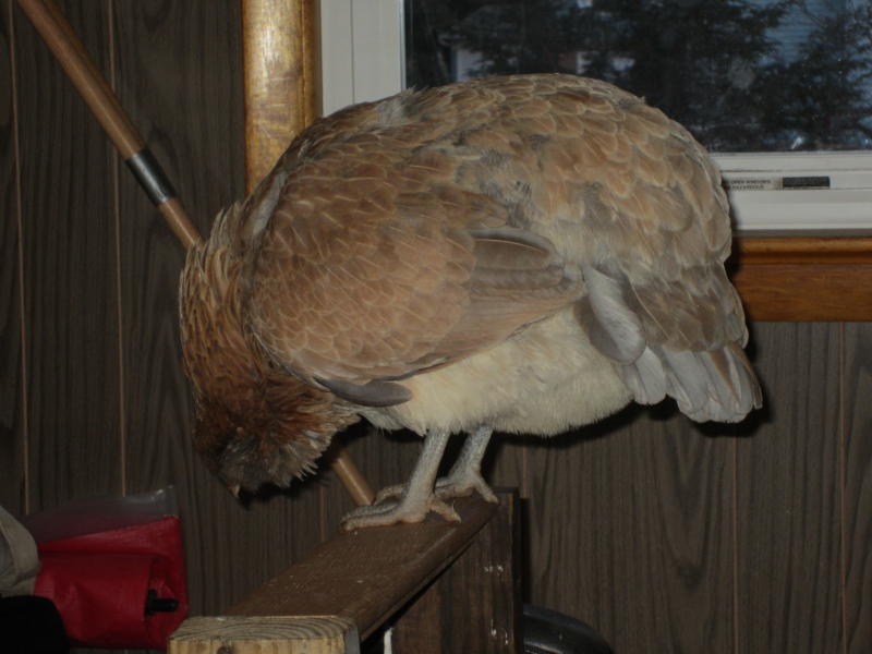 I think is in more of a curious posture seeing as to the angle of the head and neck.she definitely has wheaten ameraucauna in her. I wouldn't know what else she is bred with but if i had to guess a barnevelder because of all the feathers. did she hatch from a blue egg? she looks like there might be something wrong with her. her tail is angled low like she feels sick. check her feathers to see if it's mostly the fluffy feather types.