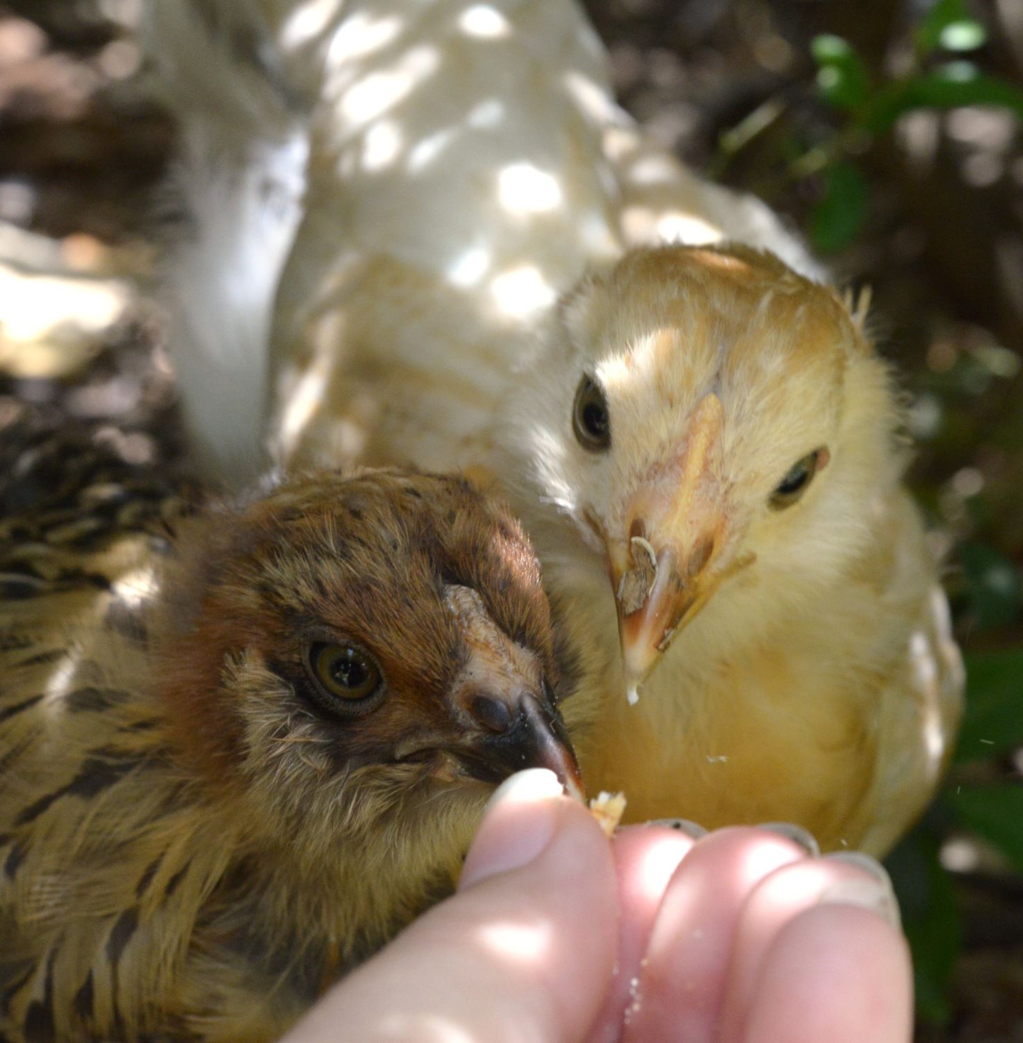 I'm hoping that when the 3 new EEs get bigger, Zorra, their "mom" will continue to protect them from the other chickens and they can keep their plumage.