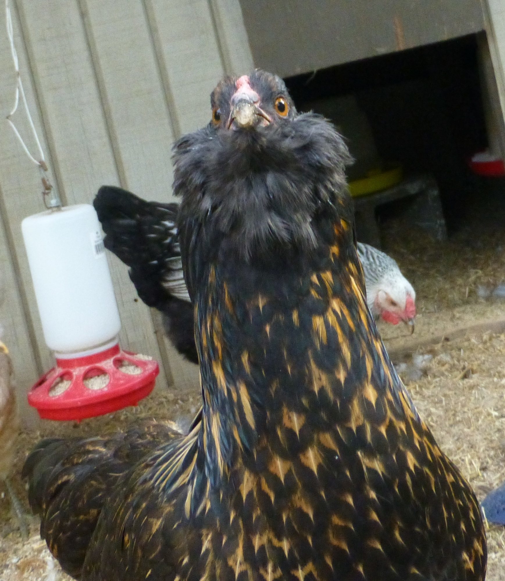 The fourth pullet is a beautiful solid black with legs so dark they appear black too. She's a full sister to Cobblepot.