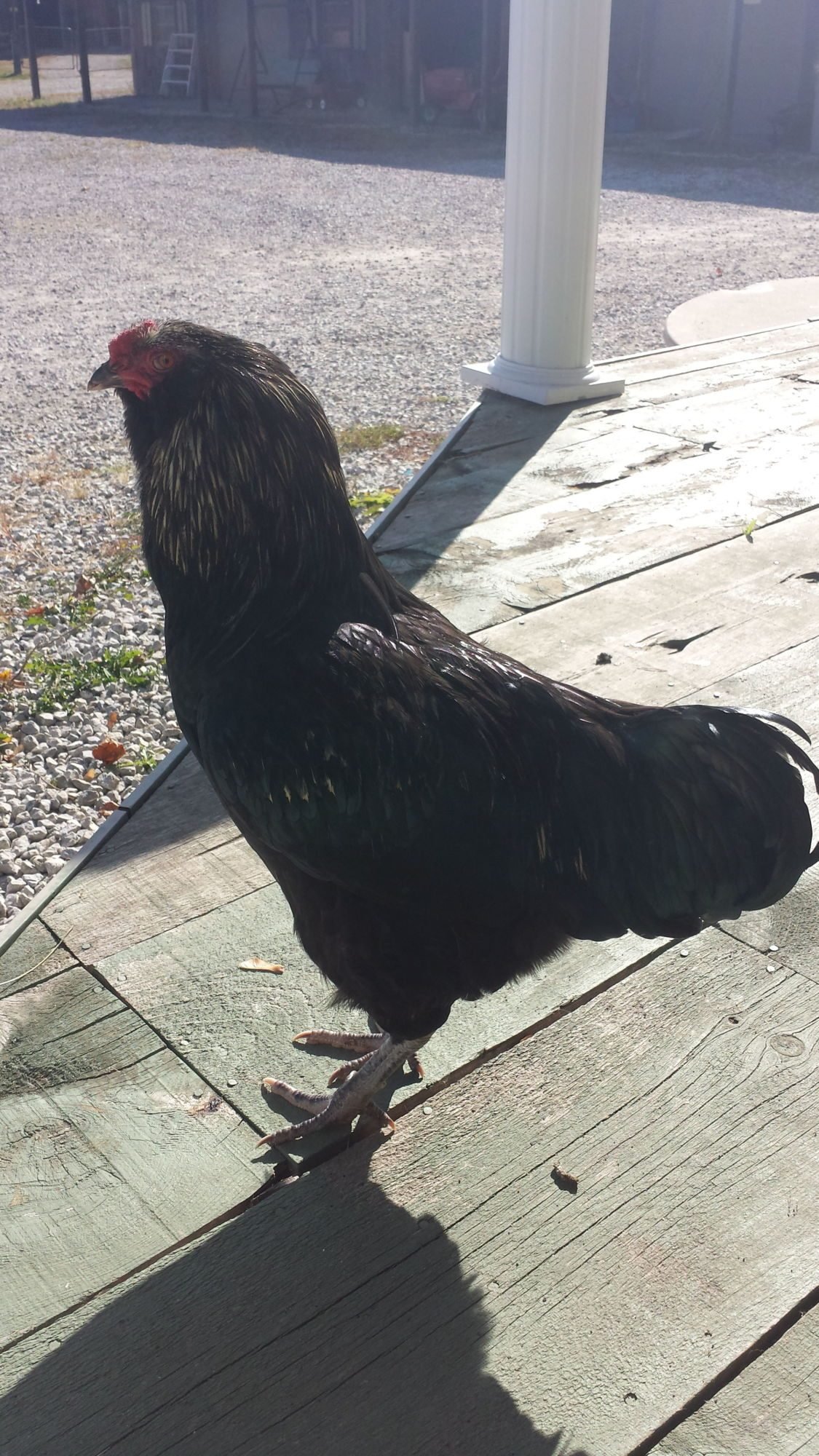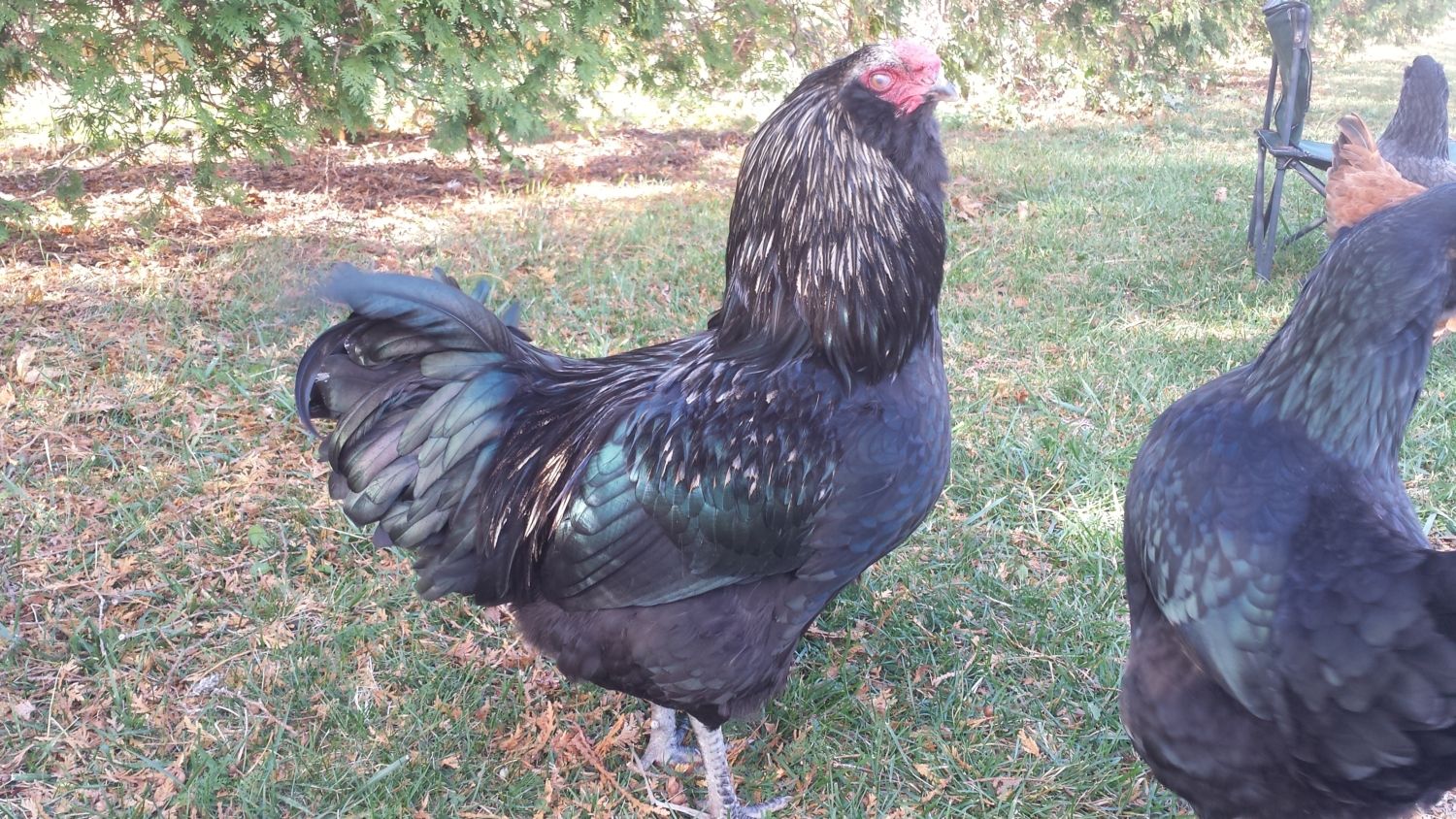 This roo has the best disposition. I can cuddle him up for as long as I want, and he's so squishy I can't help myself. lol He's also been wonderful with the hens (after a few growing pains). He definitely inherited his mother's beautiful temperament. I'm very partial to black birds. That iridescence is unreal.