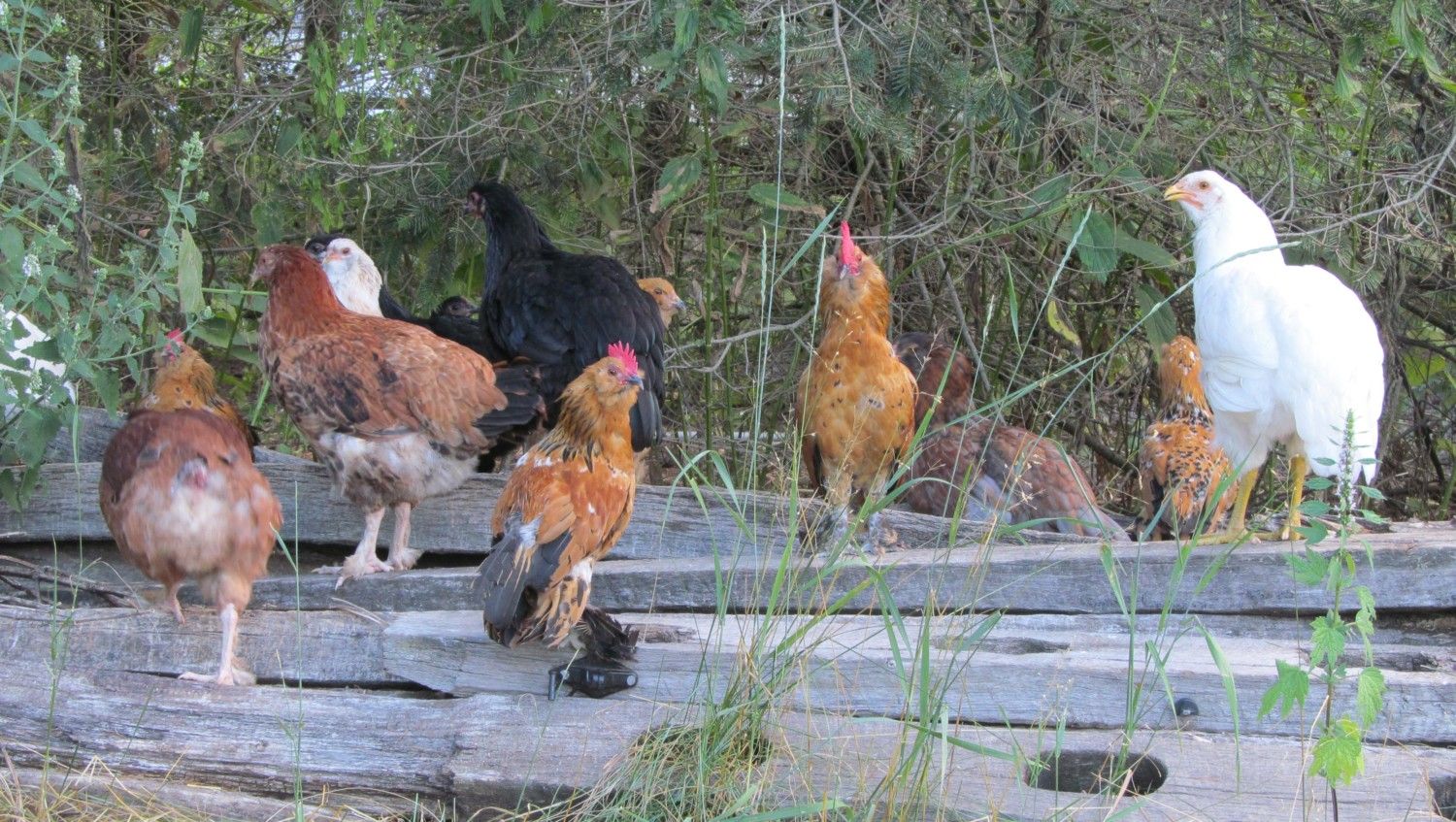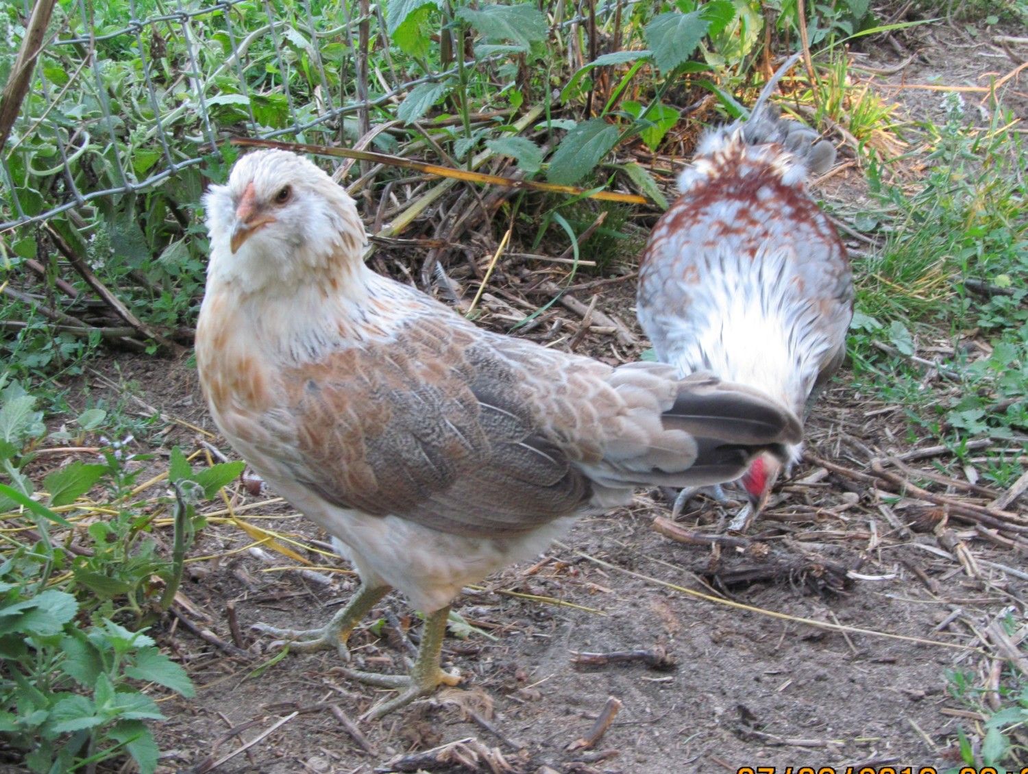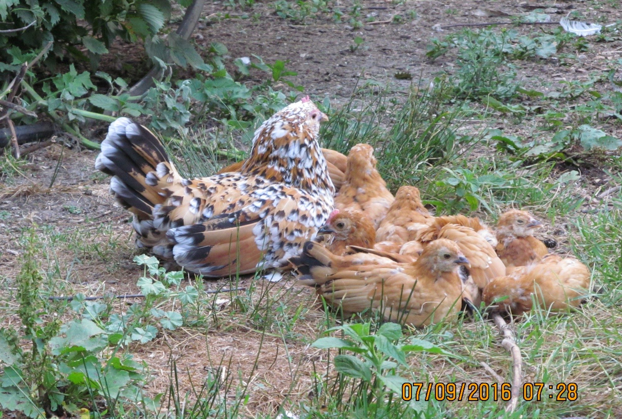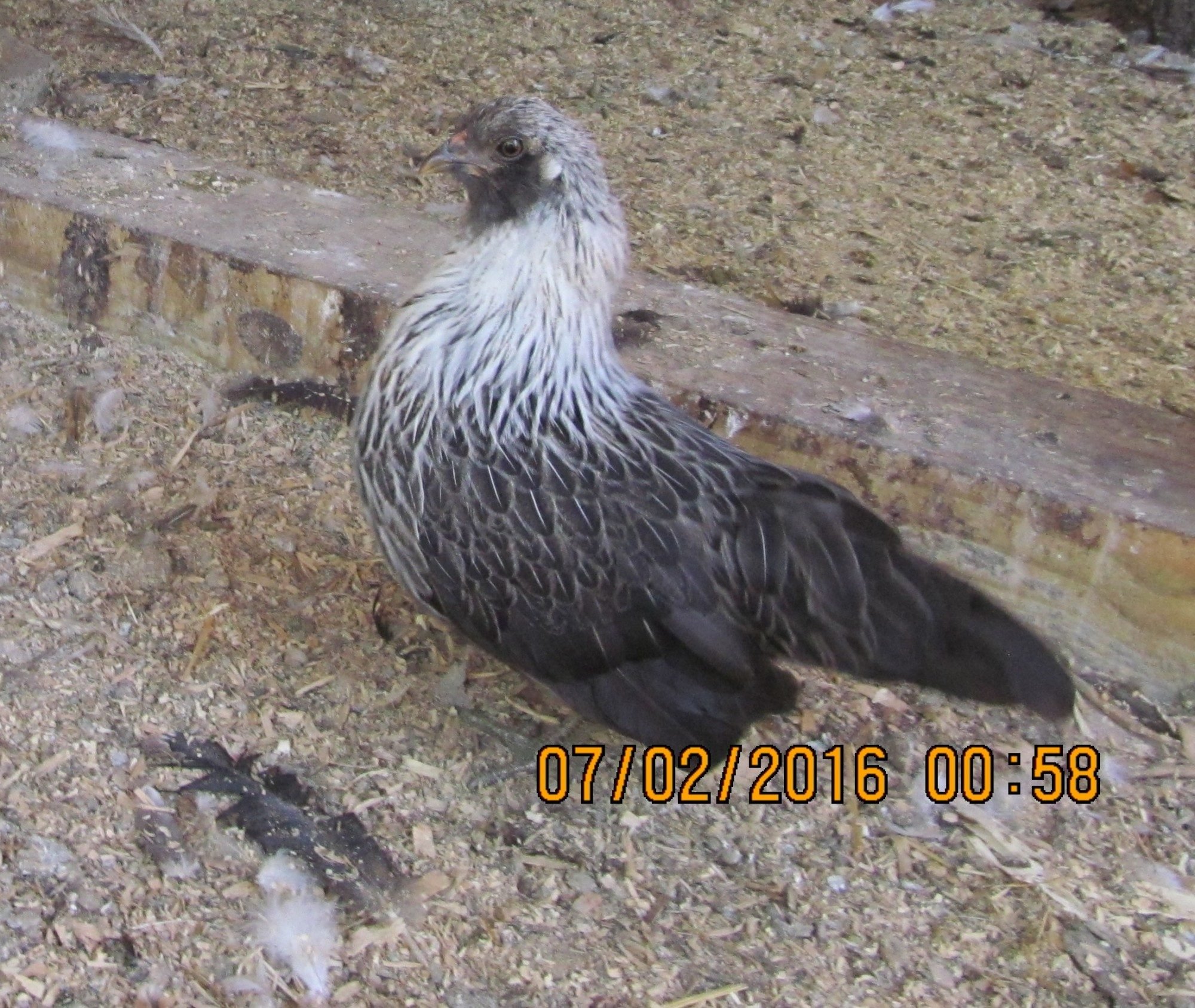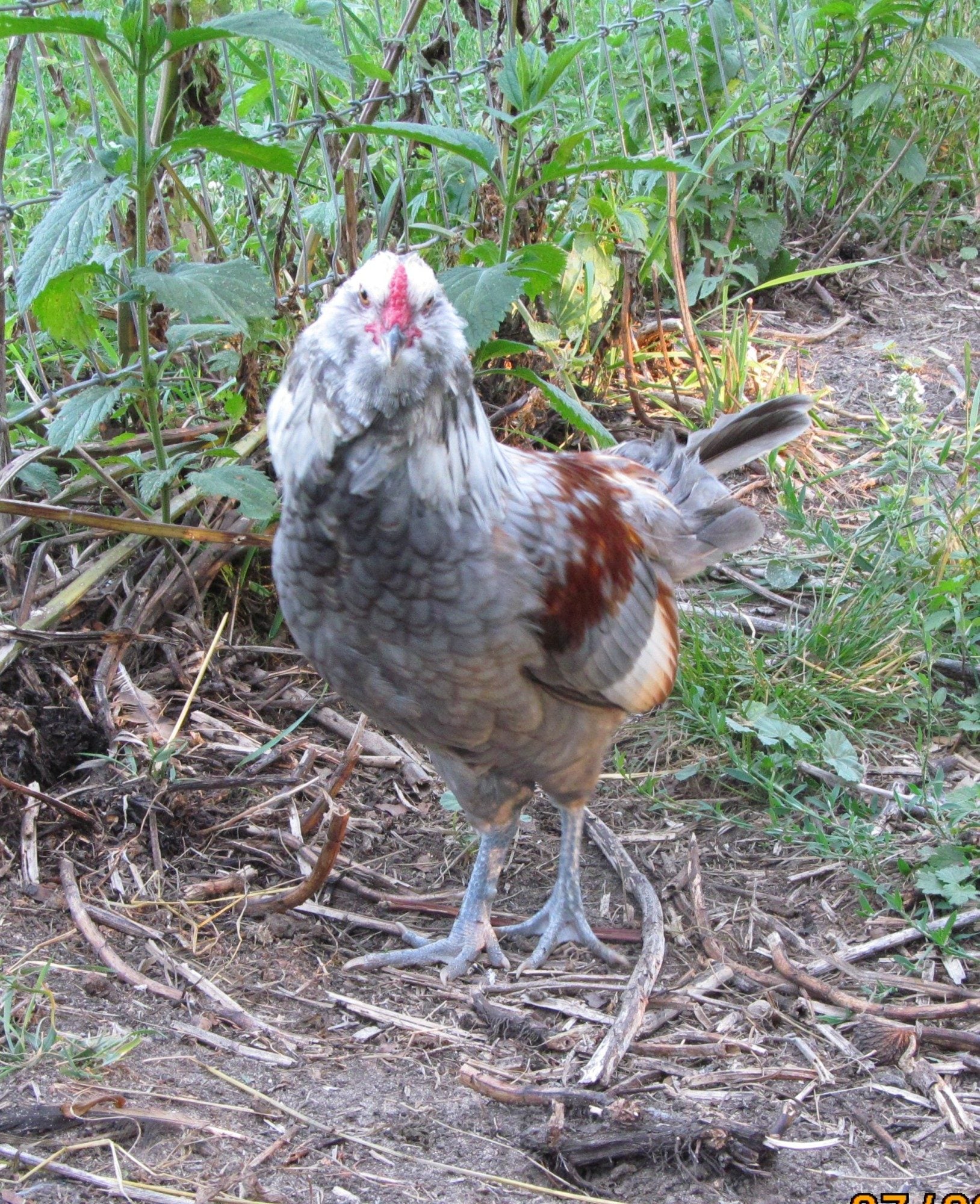 I wasn't going to keep a cockrel, but I'm hooked on these! If he stays polite, we'll see what their babies look like next year. The fourth pullet is laced gray (sort of birchen?) with the pale neck, and no red leakage. Mary