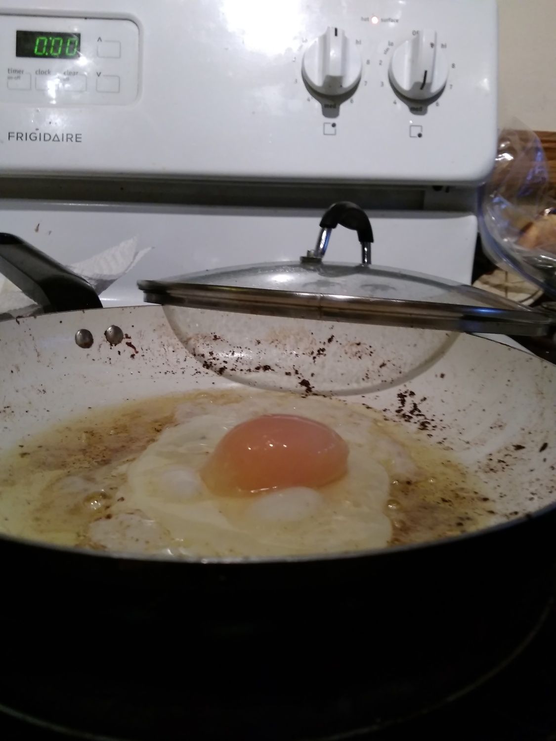 So thought I'd update...When we cracked that jumbo open it looked to be a soft-shelled egg inside of a hard-shelled egg. It was actually pretty gross and I ended up having just sausage for breakfast!Ouch! Was it a double yolker?