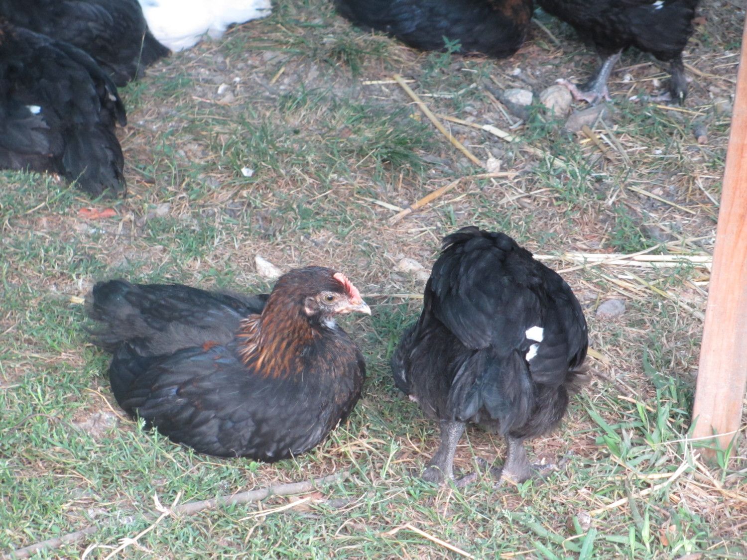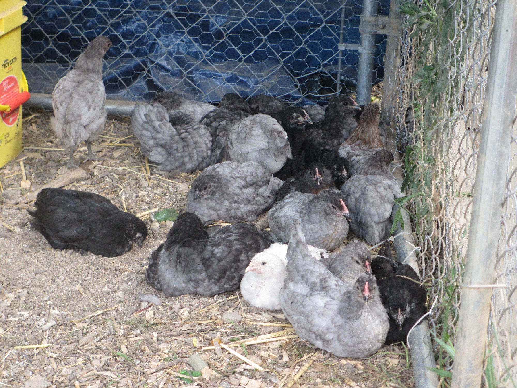 I did my head count! After I noticed the hawk was taken my biddies. I lost 11! All the babies are locked up now. I converted 2 10x10x6 dog kennels to serve as a summer hang out. I was free ranging them with the adults. That didn't work out too well. Once that hawk found them that was the end. But now I know what I have to sale. I have 6-7 week olds. Anyone live in the area and wants some let me know. If not freezer camp at the end of summer! The roo is a french standard splash maran the hens Ameraucacas, EE's and BCM. Most of the EE biddies have feathered shanks.All the marans have feathered shanks.