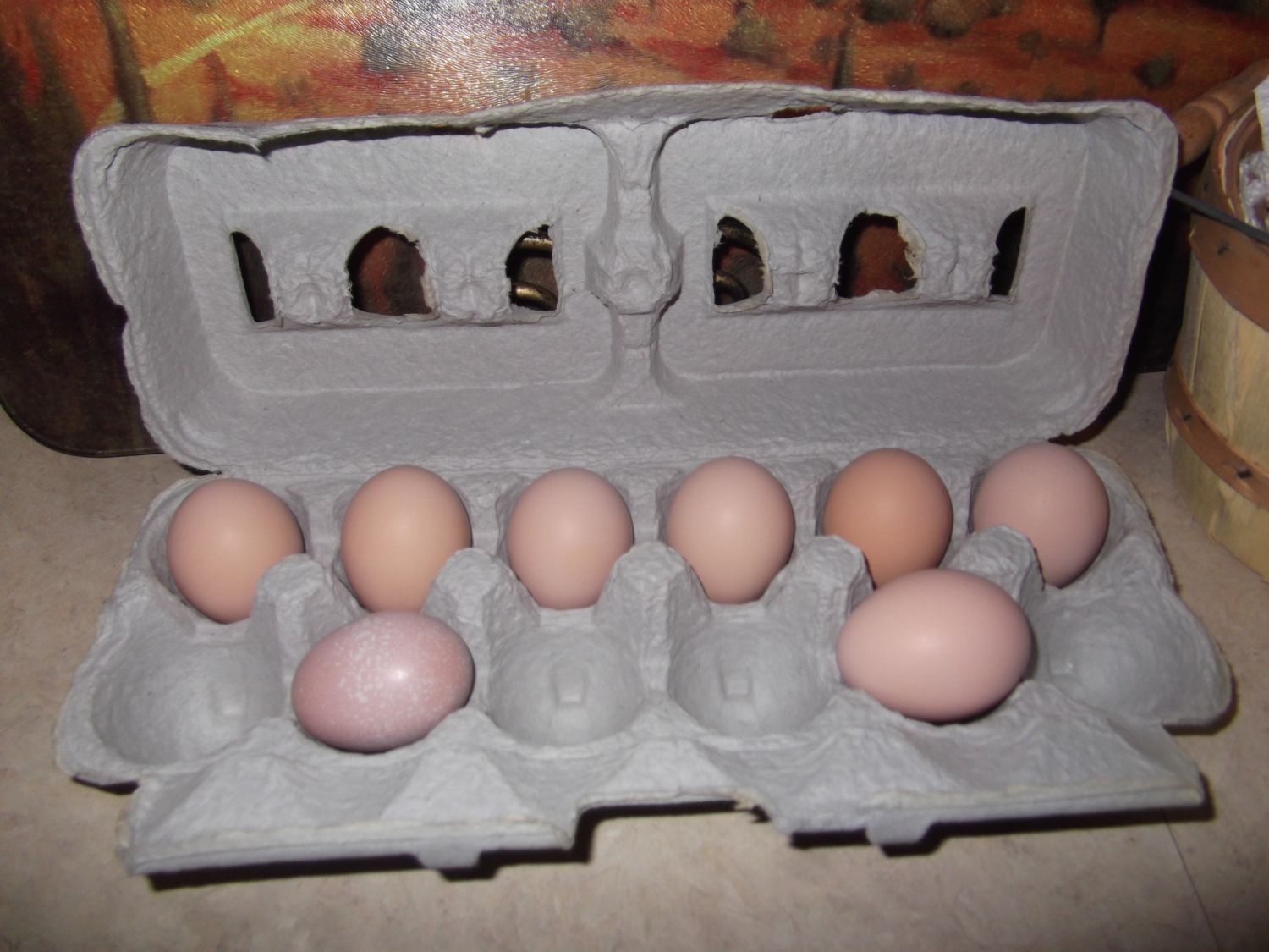 Rhodies lavender egg is on the left and Buffy's pinkish egg is on the right. The back of the carton shows their normal light brown colors. Click on the photo to make it bigger.