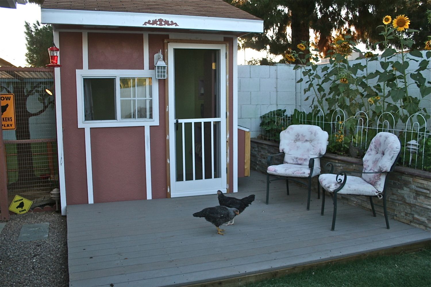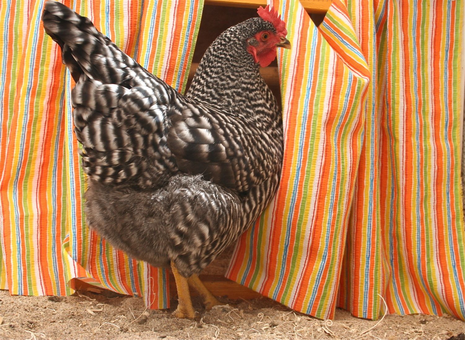 The place where Roberta laid her egg was actually the broody house/nursery. A few of my older hens thought this was a great place to lay eggs instead of their coop so since it is very hot here in AZ, I took the people door off the brooder and grabbed some fabric I had laying around. Seems every one likes the bright fabric. I keep the double doors open so everyone can come and go on the "second floor".
