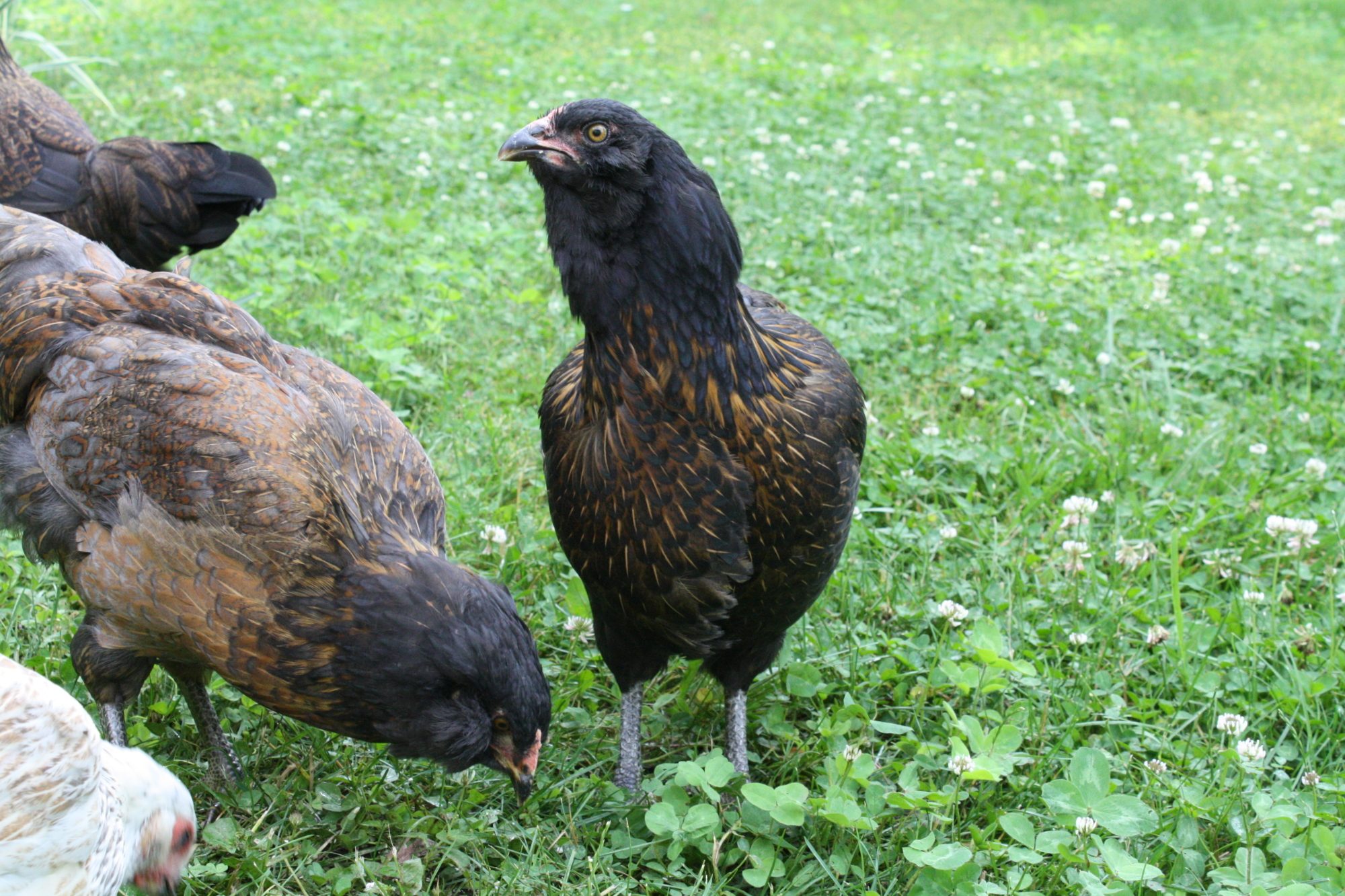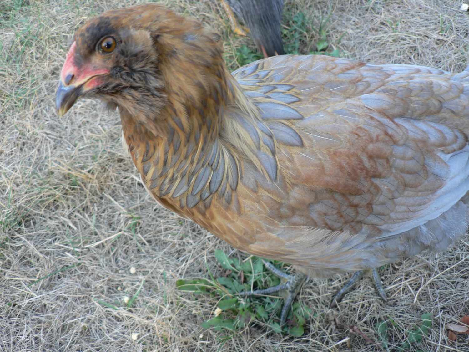 Wow! Do you happen to have any pictures from when he was a few months old? I have an EE roo that is red and black but I can't tell what he will look like. He has a flockmate that is blue with what looks like red lacing.Here is my EE roo Sunrise