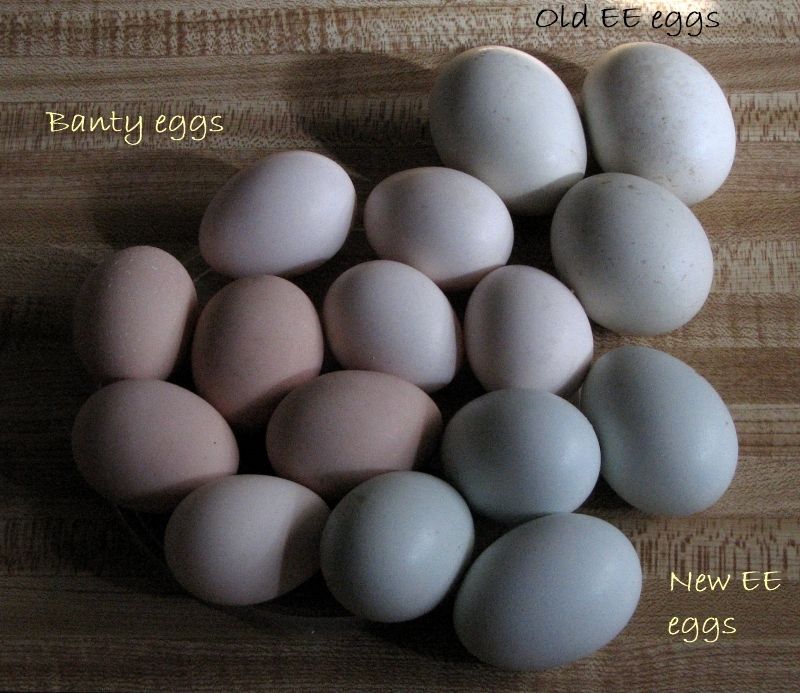 The two feed store ones I got this time have clean faces (1 hen, 1 roo from Privet Hatchery). The McMurray EEs have great fuzzy faces but were mostly gold/black with the exception of one with blue feathers in her tail and the black necked one. They all are laying on the blue side of blue green eggs. I would have really liked to have gotten some EEs with the silver wild-type coloring - or those beautiful black and white ones that I have seen some people posting on here.