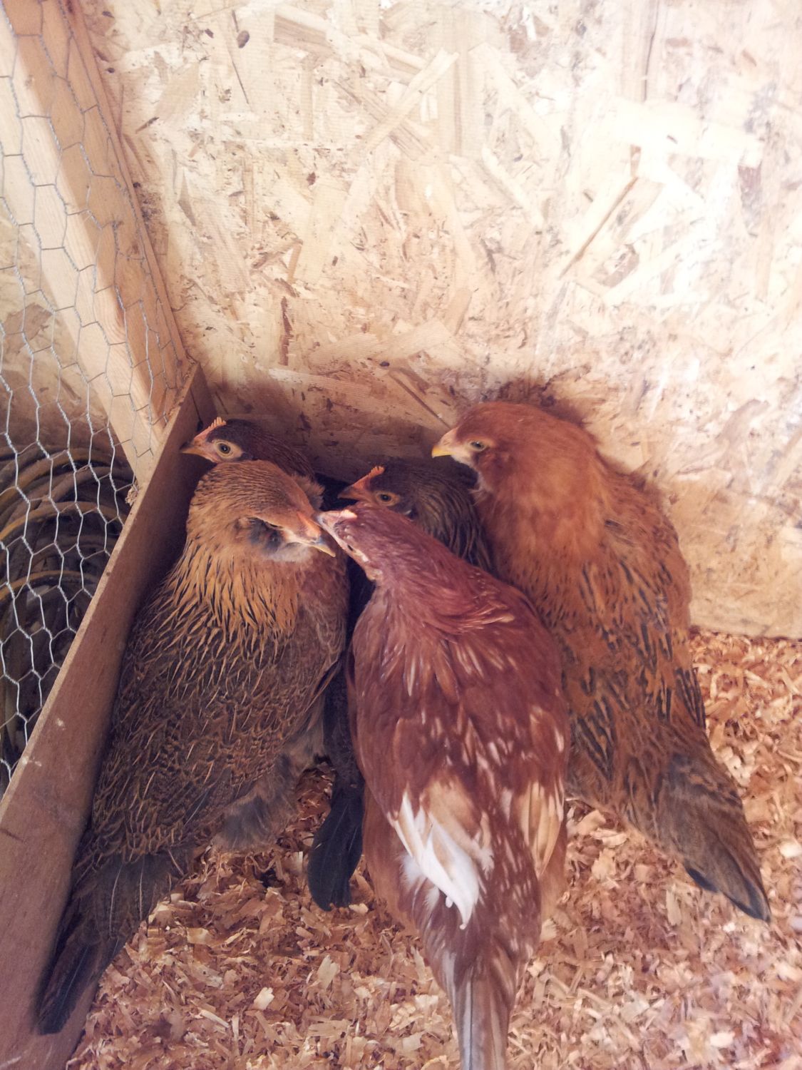 Here are two of our new Easter Eggers, far left and far right. The far left coloring is by far my favorite of our entire flock, I just hope she lays blue eggs.