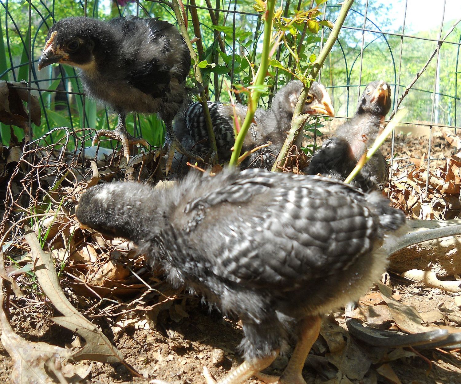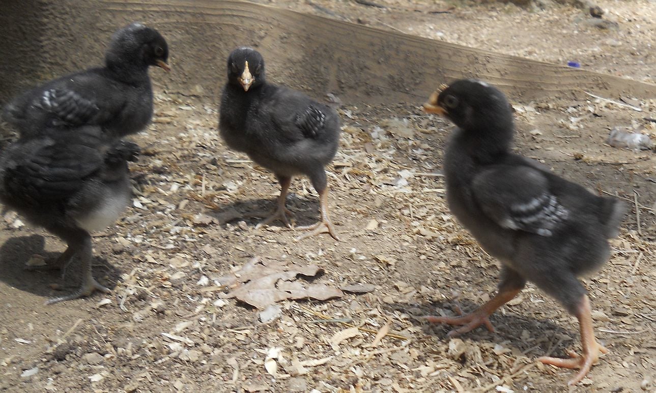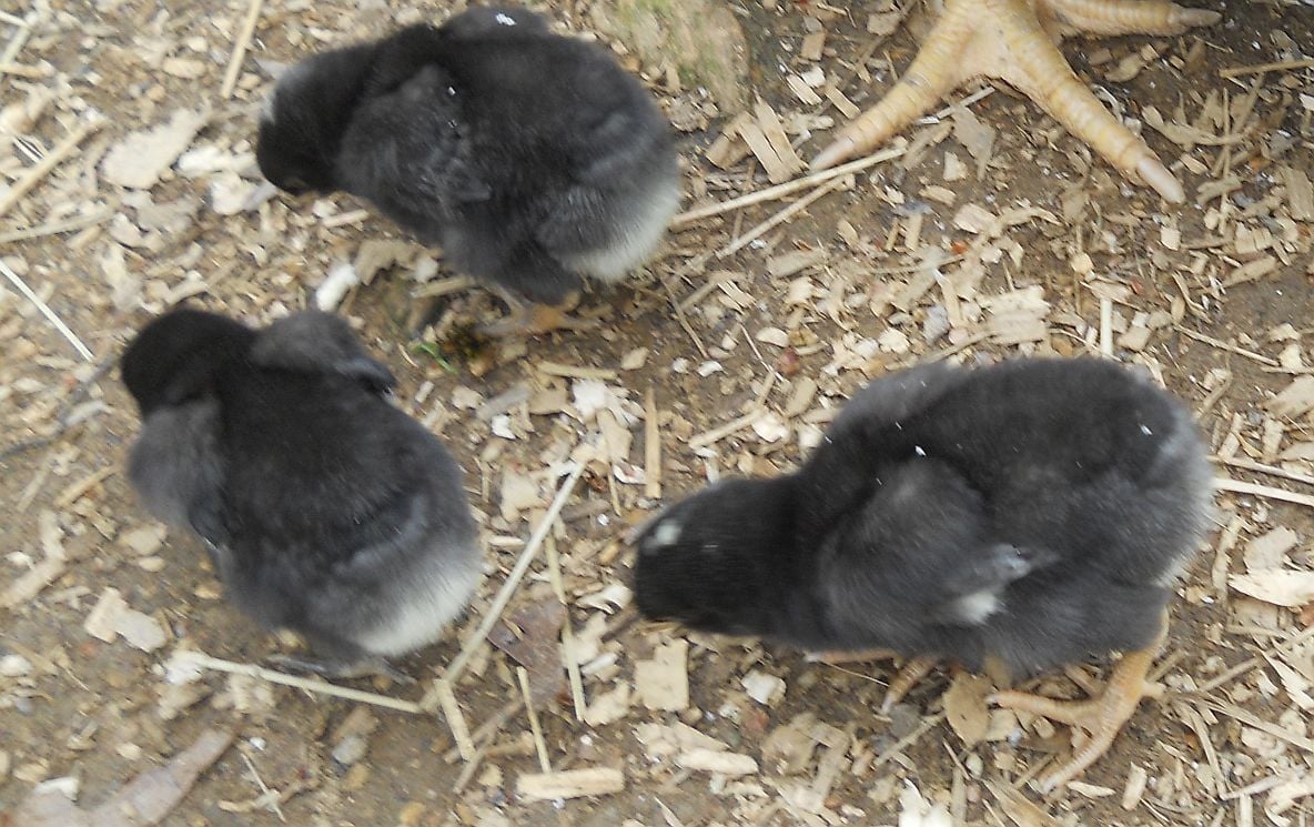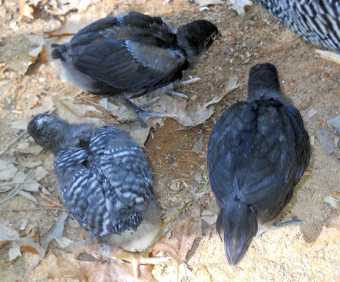 Here are the black pullets and one of the barred pullets. I will be selling both black pullets as well as one of the barred pullets when Dottie is less enthusiastic about mothering them. If there is a late blooming single barred cockerel in there rather than a pullet, I'll know by the time Dottie lets them go, but by 4 weeks of age, you usually know with these.