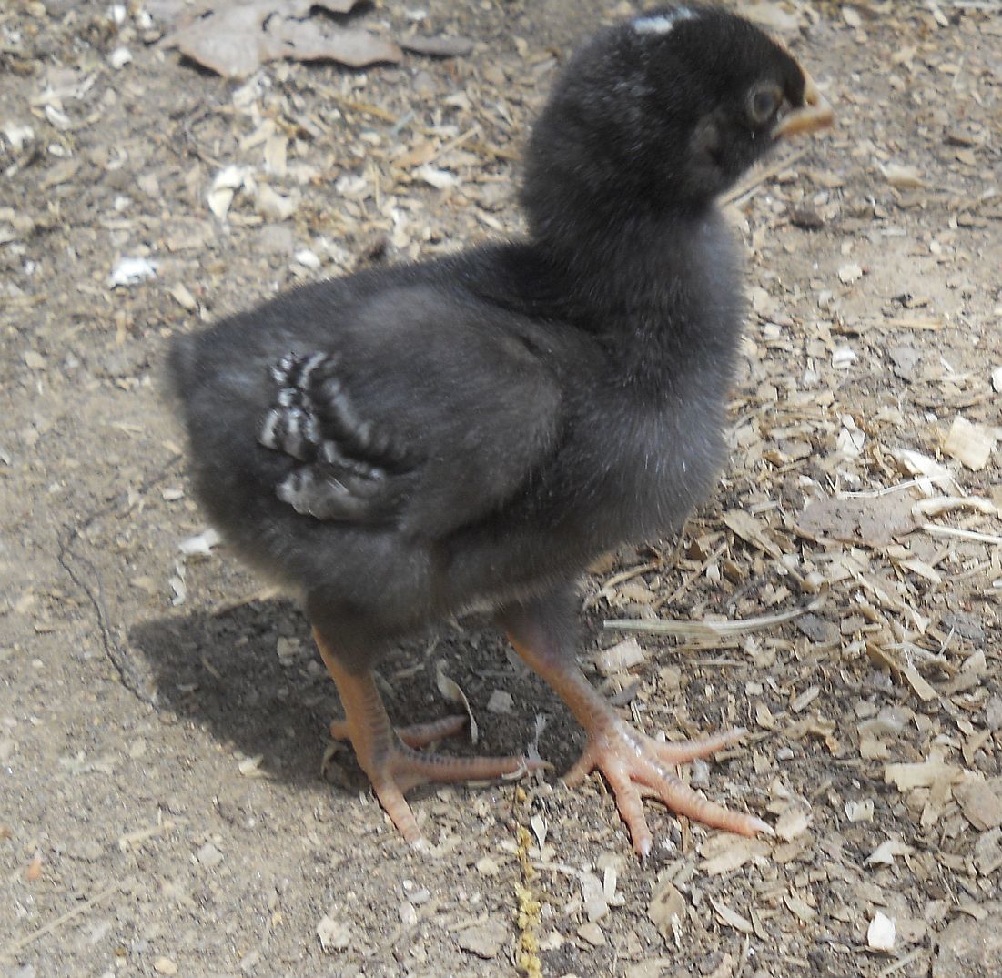 These chicks are the result of the first hatch from them, my F1 group. No, I didn't toe punch or wing band or in any way ID which chick came from which hen, other than to know that one of the black pullets is from Ida's egg, the last to hatch. These are being broody raised, by Dottie, so obviously hatched under her, making it a tad difficult to know which was which. Two eggs were Dottie's, one was Wynette's, one was Ida's ( I know this was a black pullet, last to hatch) and one was a BR egg but I wasn't sure which hen laid it so could be Druscilla's, the original Rex's daughter with Dottie. Two pullets are solid black due to Rex not carrying the usual two barring genes of a regular BR male. There are two barred pullets and then there is a very promising cockerel I have named Atlas.