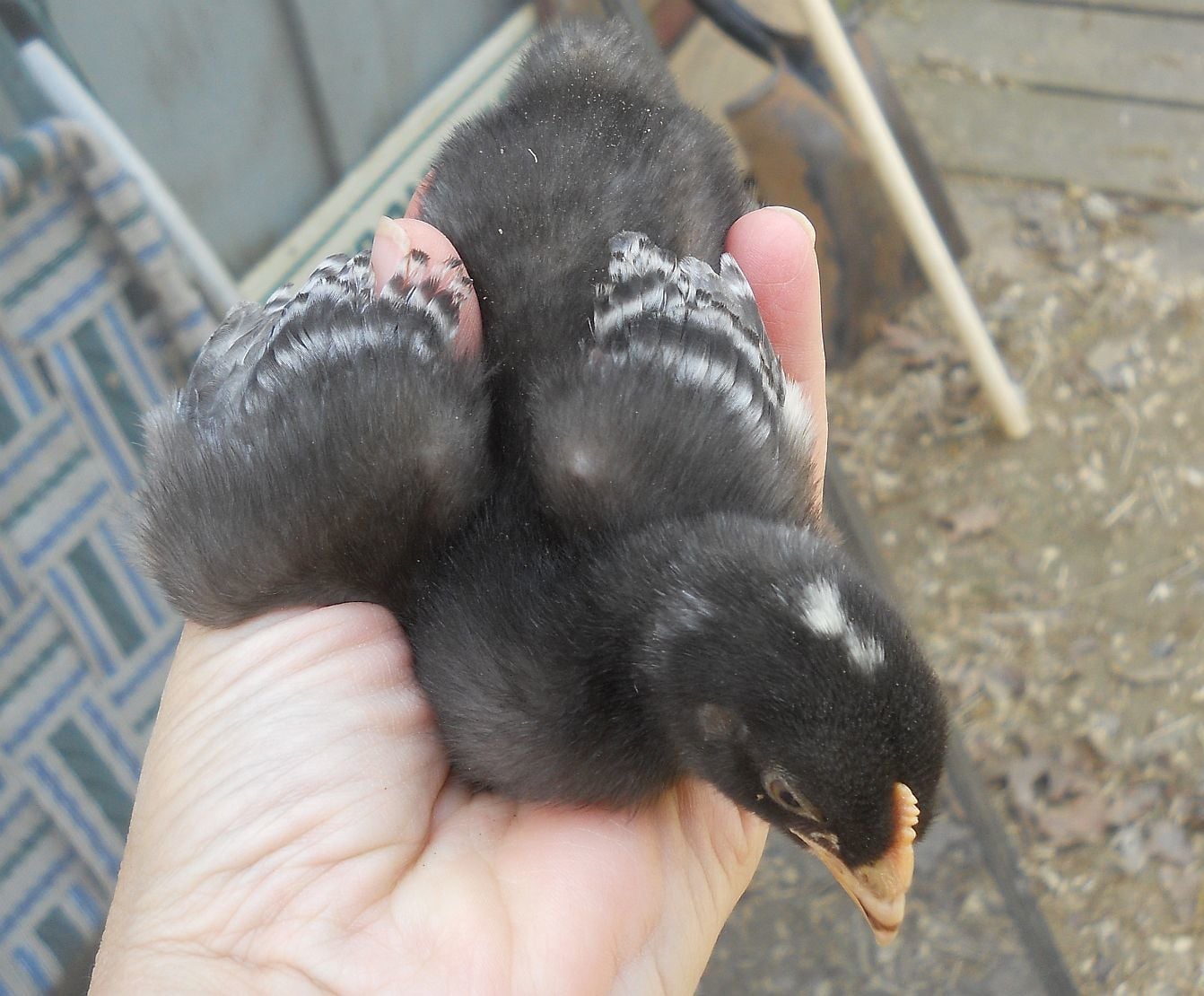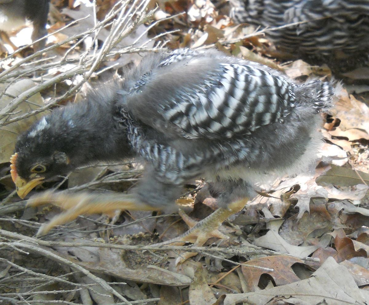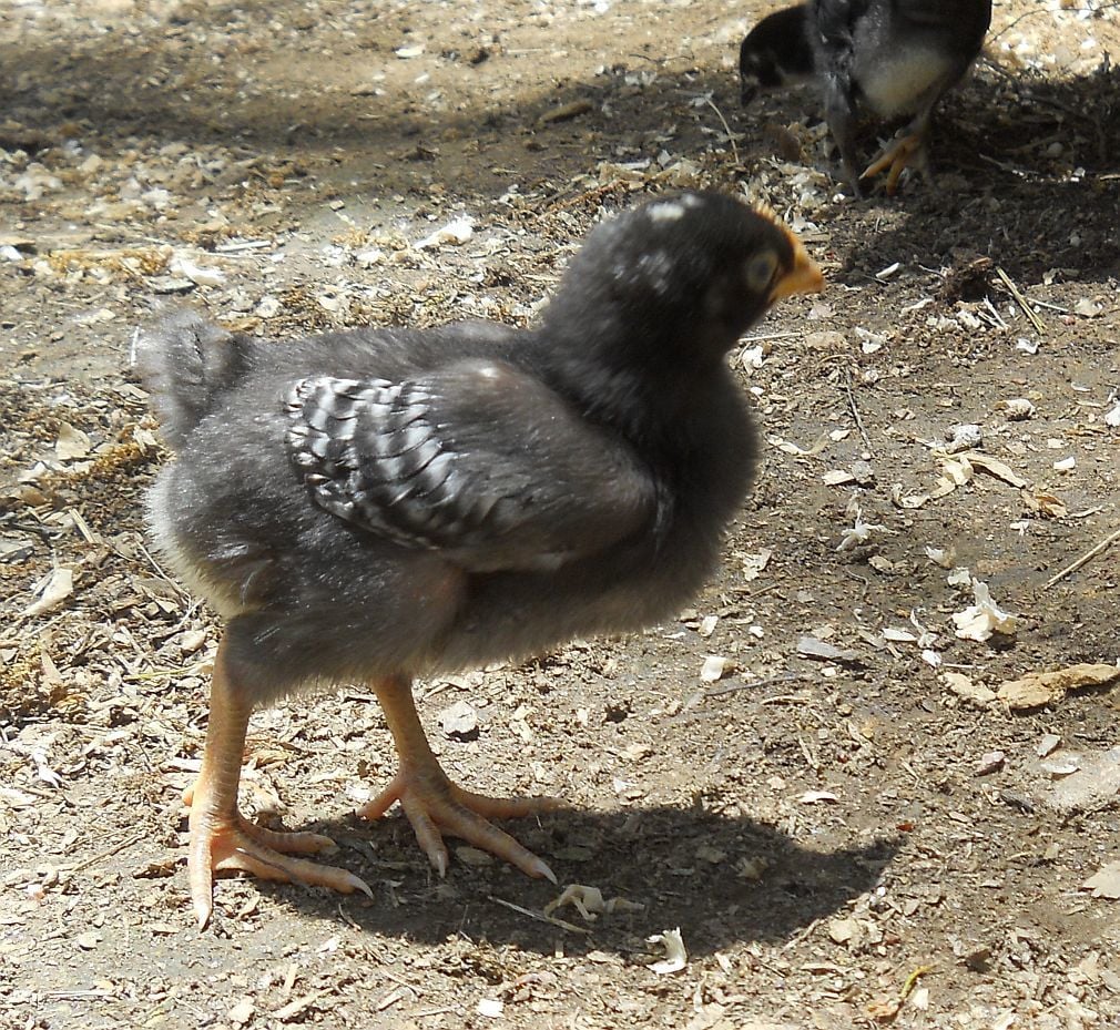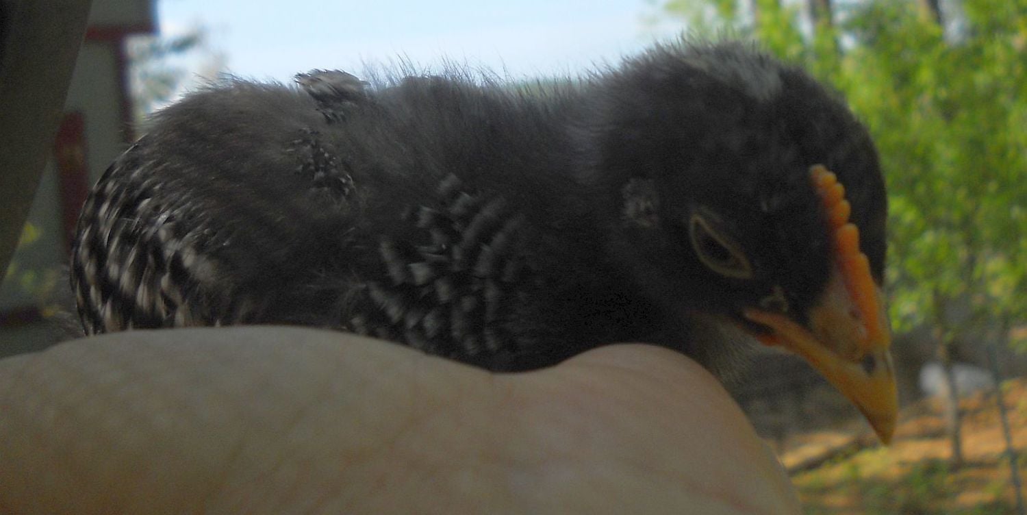 To start, they all seemed like pullets. Atlas had, at first glance, the smallest, most defined head spot of all, was very dark, and in my years of experience with BRs, seemed to be the most definite pullet. However, I didn't notice the tiny shadings of frosting on each side of the back of the head that usually indicate male so surprise! I got my possible Indy replacement. As his barring came in, I held my breath as I watched the lines form in sharp precision on the little wings. Now, Atlas and his sisters are 4 weeks old and I decided to follow his progress in this thread.