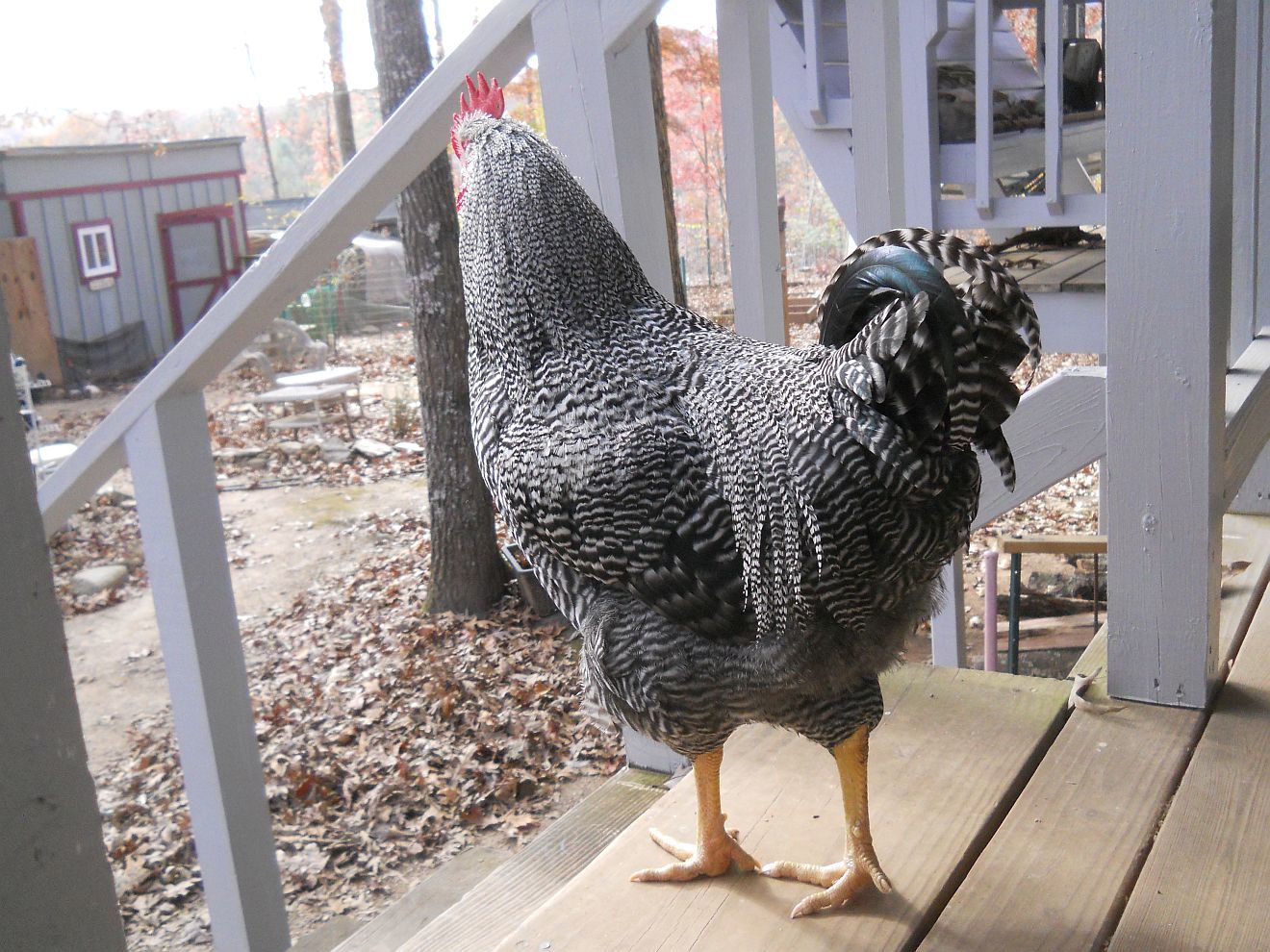 I had a nice breeding group of Marvin Stukel line Barred Rocks, still have the hens. I made a decision to give my breeding rooster to a friend for his own, who was subsequently killed by a poisonous snake so that I didn't even have access to his progeny in the future. I was left with three hens and one of his daughters out of one of those hens. As males, I had several sons out of the Stukel hens with my heritage line Delaware rooster, Isaac. I rehomed one as his size was not what I wanted and his personality was not as calm as the others. One in particular was very impressive, not appearing to be a cross at all and absolutely huge. This one my DH named Indy, and he and his single factor barred slightly younger brother, Rex #2, were my chosen keepers, though I had put all my figurative eggs in the "Indy" basket. Wouldn't you know it, though? Indy was killed at about 24 weeks old by his sire, a lucky hit on the back. So, I was left with Rex, named for the original Stukel male, his uncle.