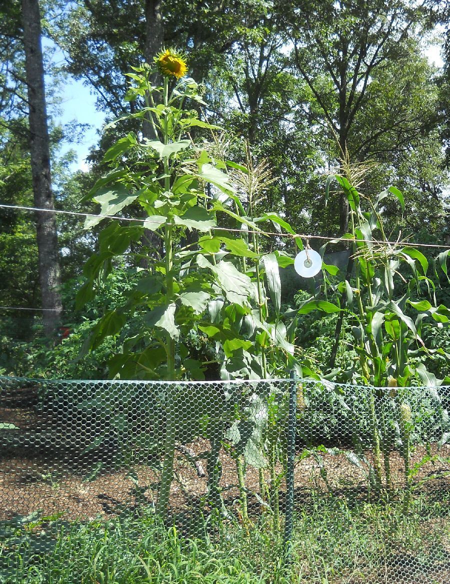 And one giant sunflower that was masquerading as corn, or thought it was. The deer have chomped on it from over the fence, but they can't reach most of it! I guess it was dropped by some bird or came from the scratch mix since I did not plant sunflowers in this garden.