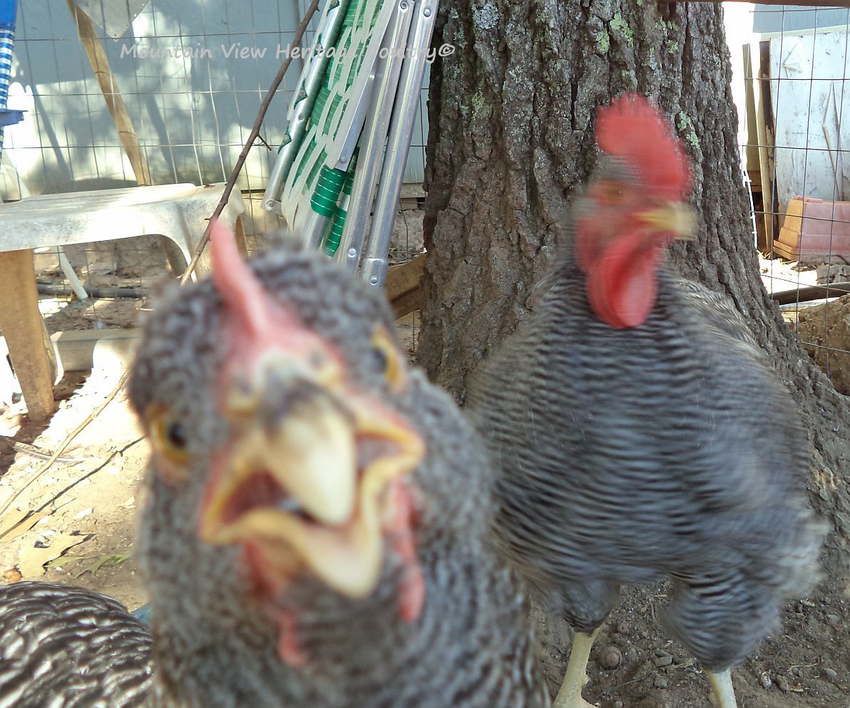 ....and bonus, Hector crowing (if you can even say that's a bonus, good grief). You hear the D'Anvers first. Turn up your volume and listen for Hector's wheeze at the end. He and Apollo are standing at the top of the rock wall in front of the barn.