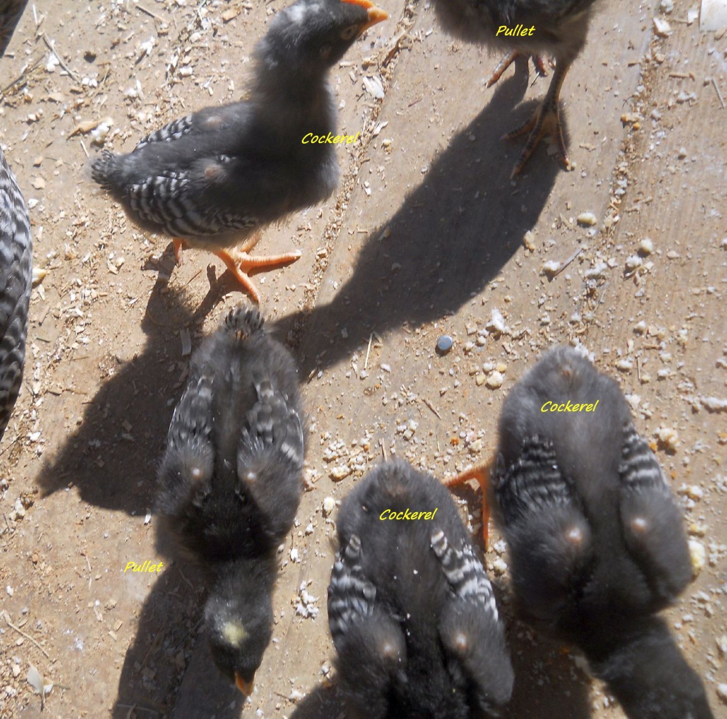 As far as females growing feathers down the back before males, that is how I tend to determine gender in the BBS LF Cochins we have. They mature painfully slow, and comb size is not a good indicator until after 6 weeks (more like week 8 and later). I can sometimes go by which chicks start to feather on the shoulders first.