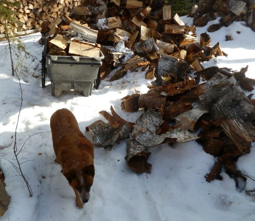 Here we are happy to see the latest birch pile is dwindling...being a lamb like March for us, first two days were lion nasty but since been kind warmish weather. Pleasant enough Fixins would conduct her firewood inspection duties from under a tree, soaking up the sunshine streaming forth.