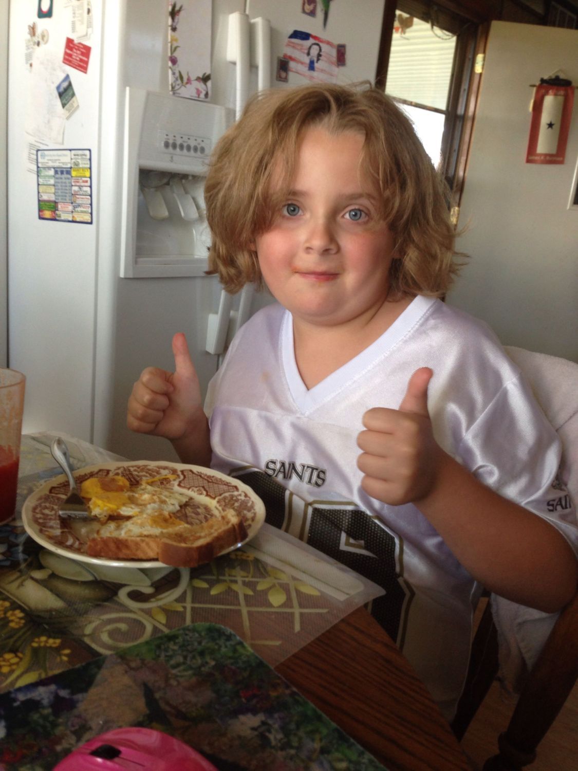 Katie eating a couple of "Ida eggs" with toast and a glass of tomato juice - she's loving it!