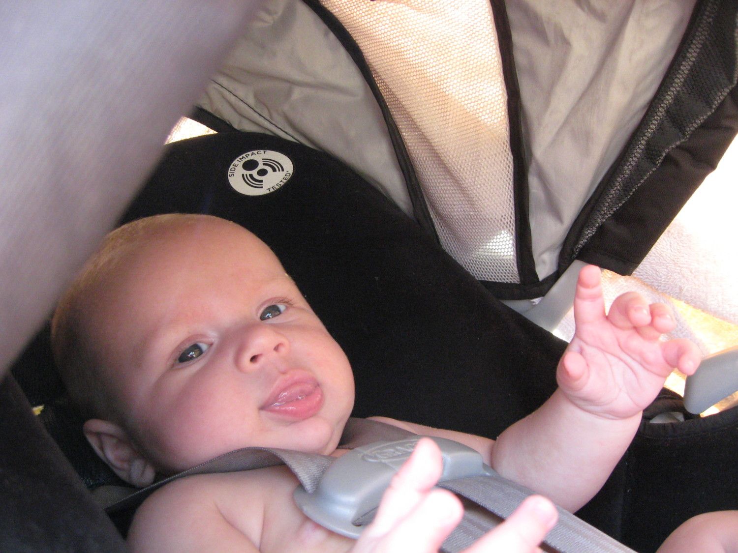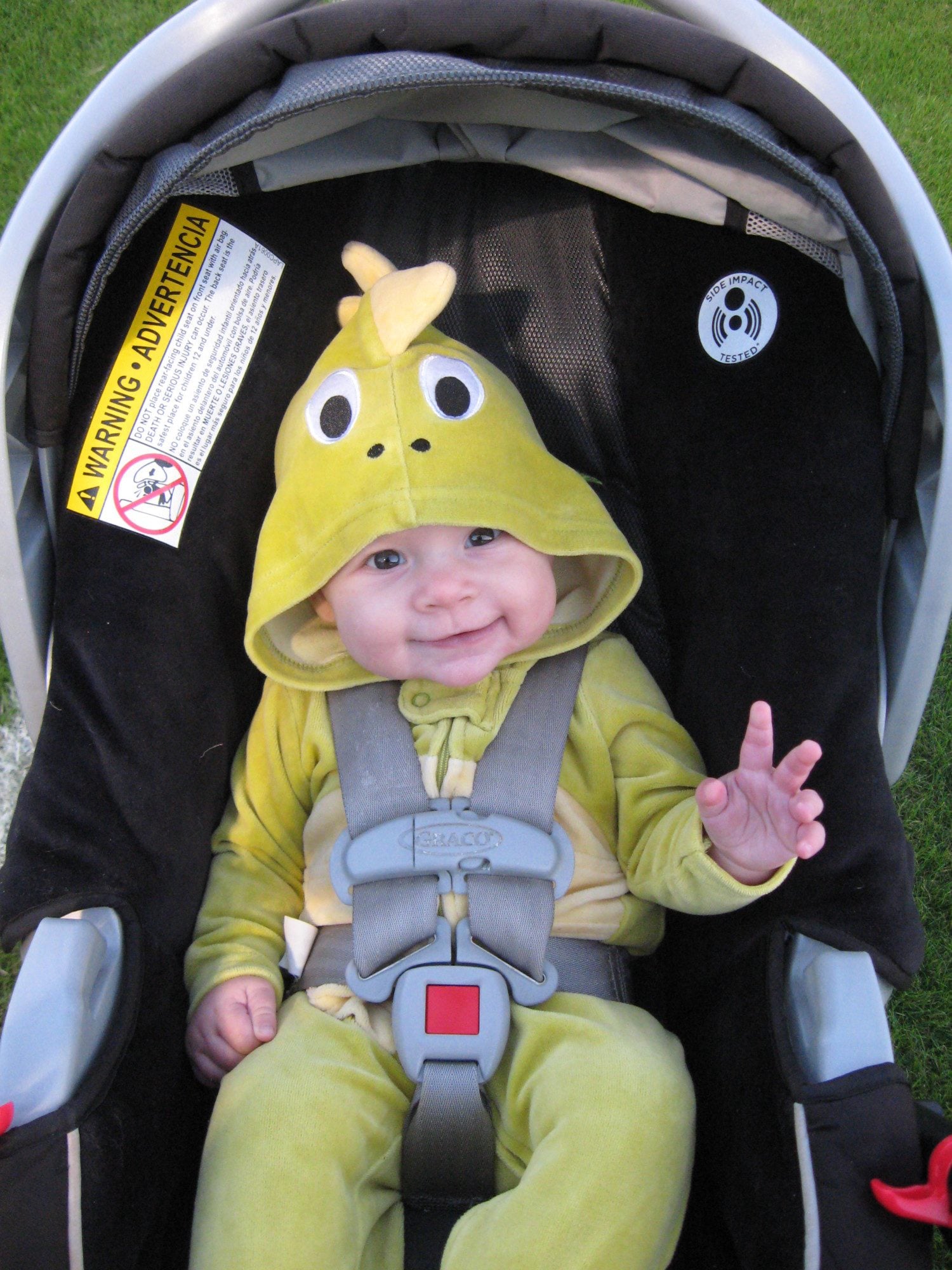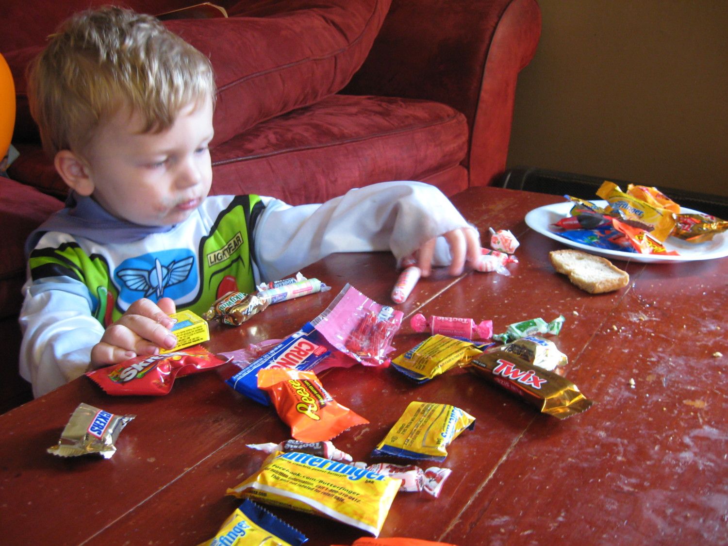 He actually walked most of the way (as long as he had some candy in his mouth to distract him from the fact I was holding his hand). When we got to the car I put him in and he came right back out to come get the pumpkin. Haha. He had to hold it on our way home and actually shoved some in my hand to open for him (the closest thing to asking for help he's ever done). He said trih-trea (trick or treat) afterward, when we were away from all the craziness.