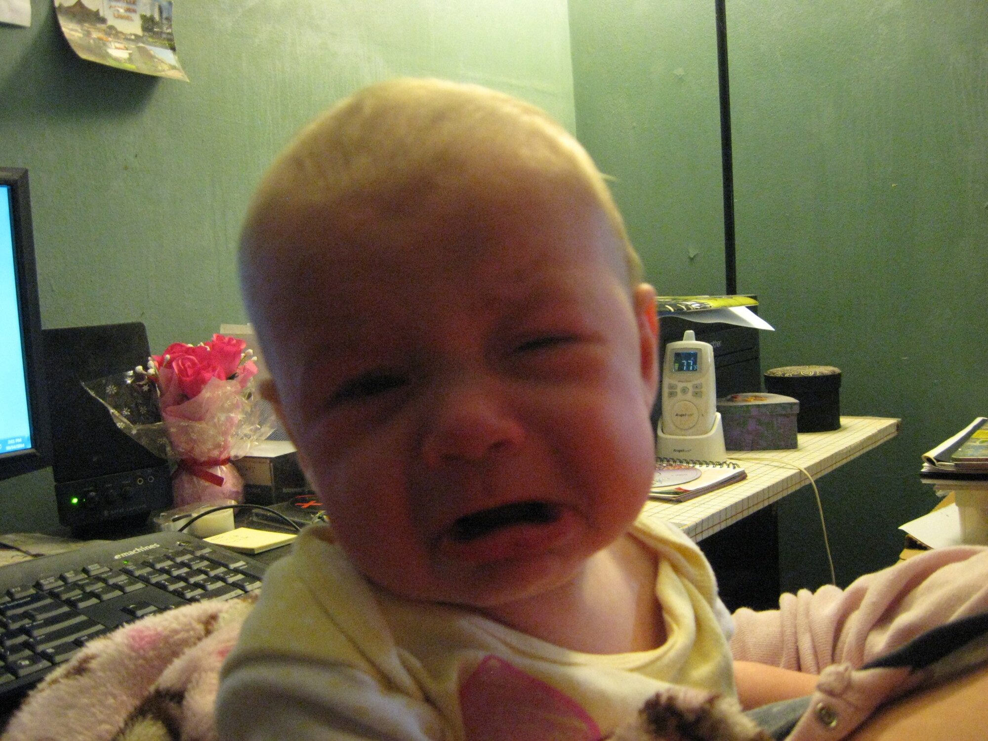 God, I remember the faces. Spoil rotten. (mine were)Amelia is a "hold me all day or I'll scream" baby. She's the total opposite of Thomas. That boy could hapilly lay in his play pen all day. Amelia HATES the play pen. Occasionally I let her cry it out and she'll play a bit with her toys. If she cries too long or ups the ante (upset cry to furious cry) I get her back out. Sometimes it's just "Sorry girl, I gotta pee, I'll be back". Thomas gets jealous if I'm holding her, so he'll climb on top of me too. It's not unusual for me to sit at my desk with a kid on each knee.![]()