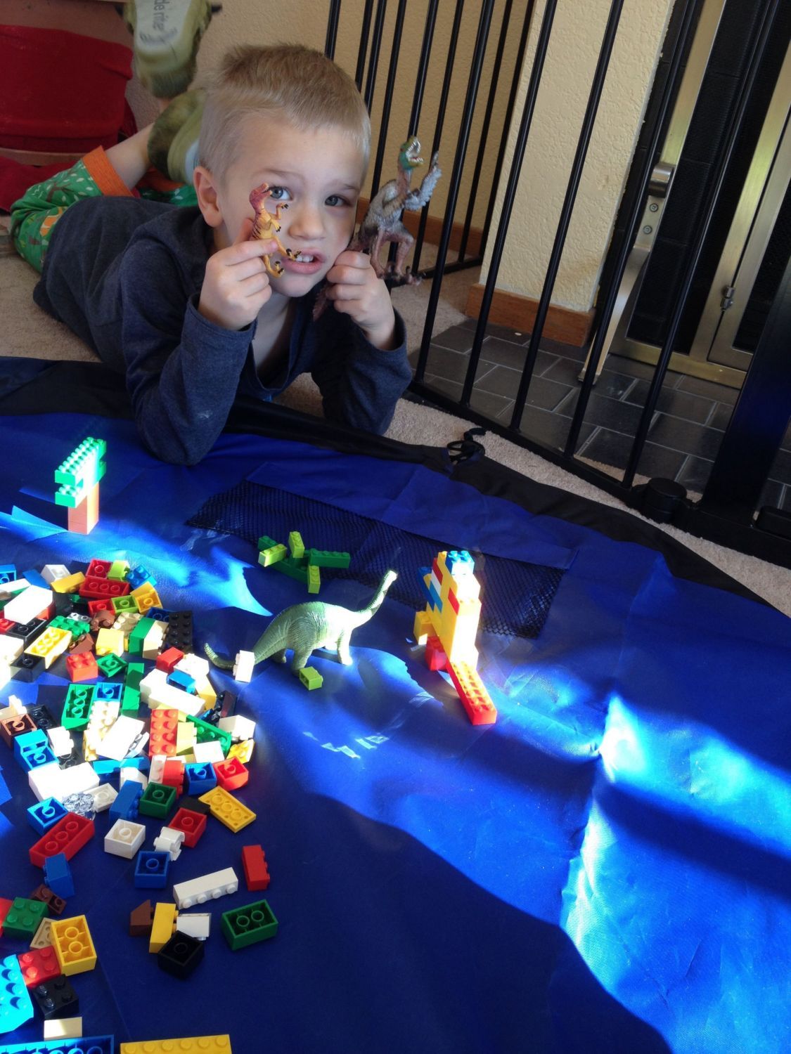 I love the pictures! Katie did so well on that quilt! My son never got into blankets or stuffed animals much. But he does have certain toys he gets obsessed with for awhile. Here he is on Christmas. He's making a Lego habitat for his dinosaurs.