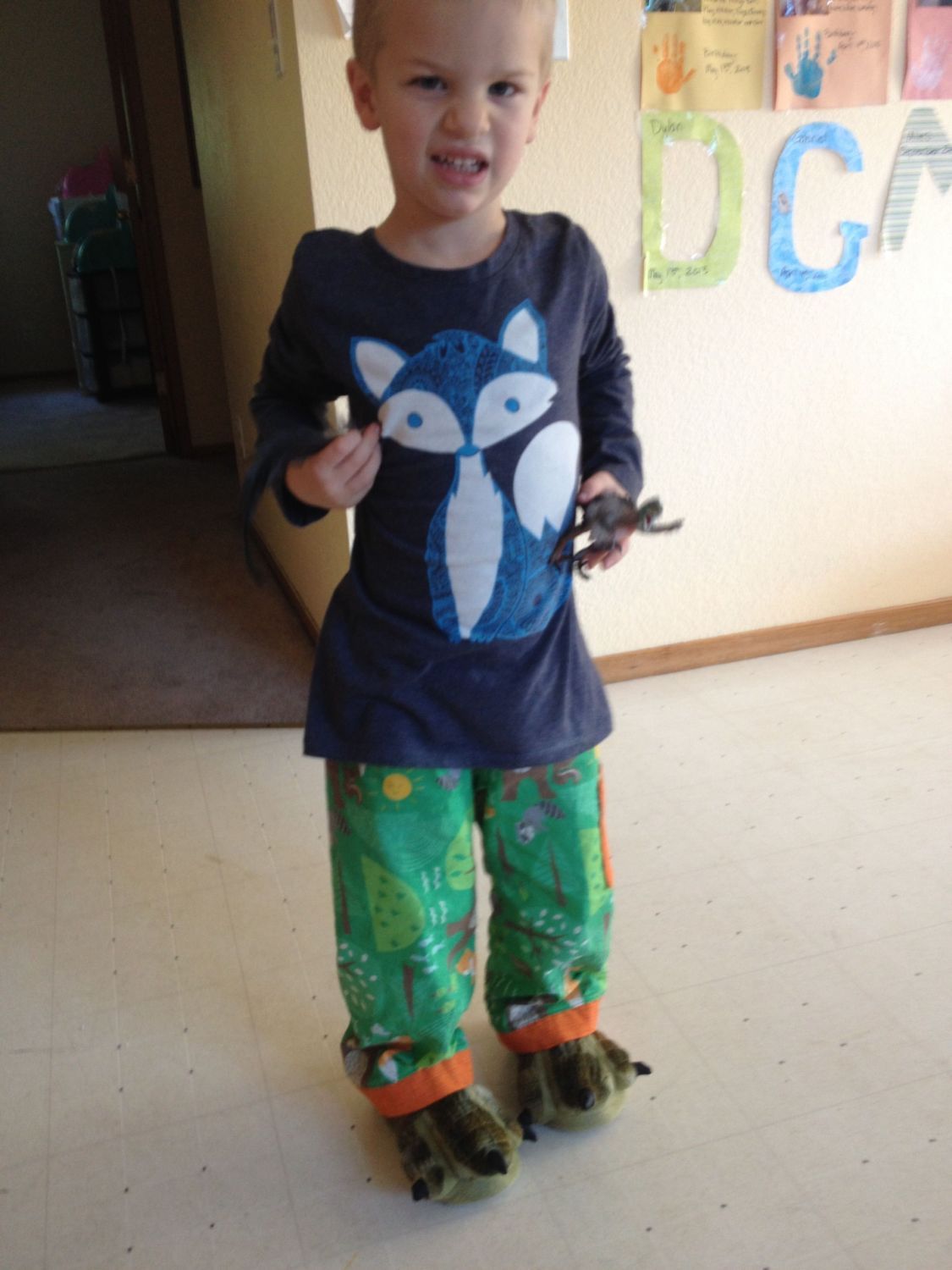 You can't see his awesome dinosaur slippers my friend got him in this picture very well, so here is another one