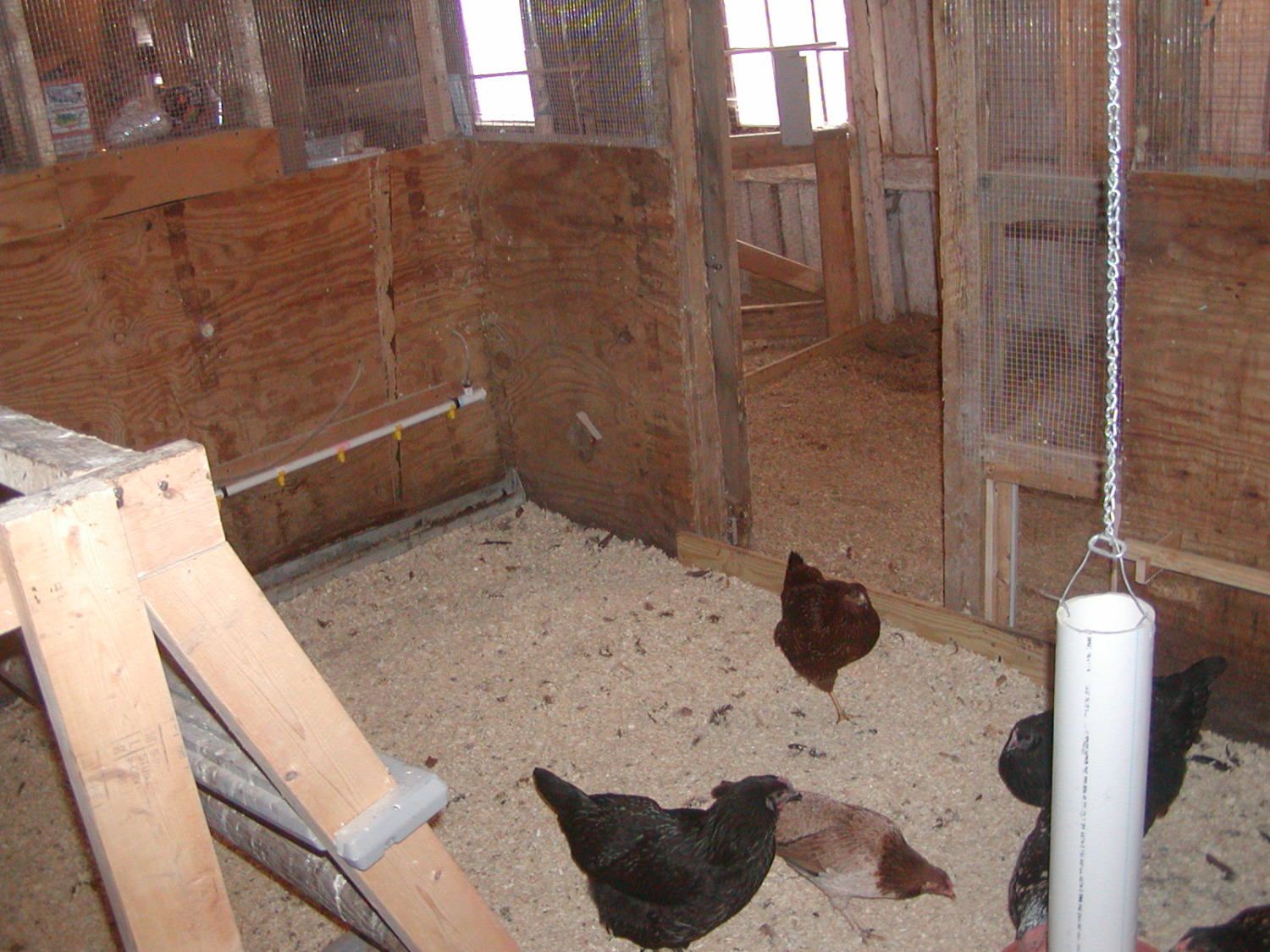 Water pipe before it was built into the nest box. The Pullet-shut door is now on the right where that block was covering a "big enough for an ermine" hole in the plywood.