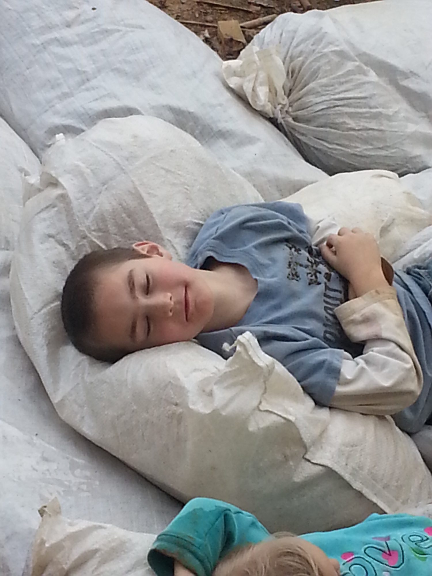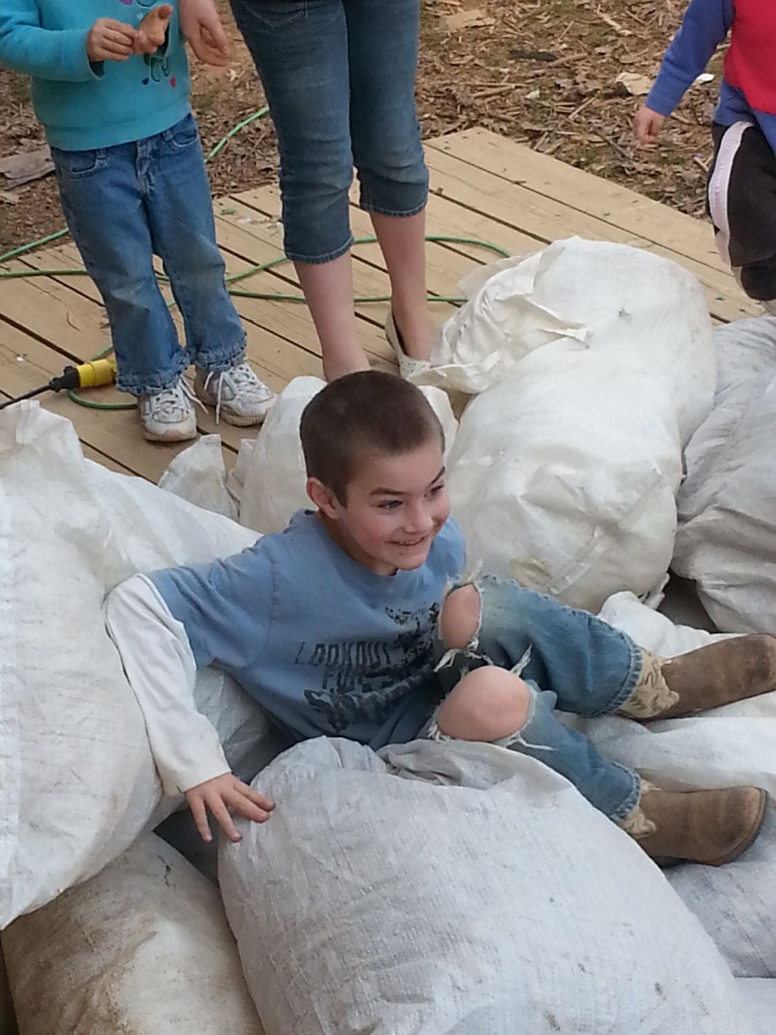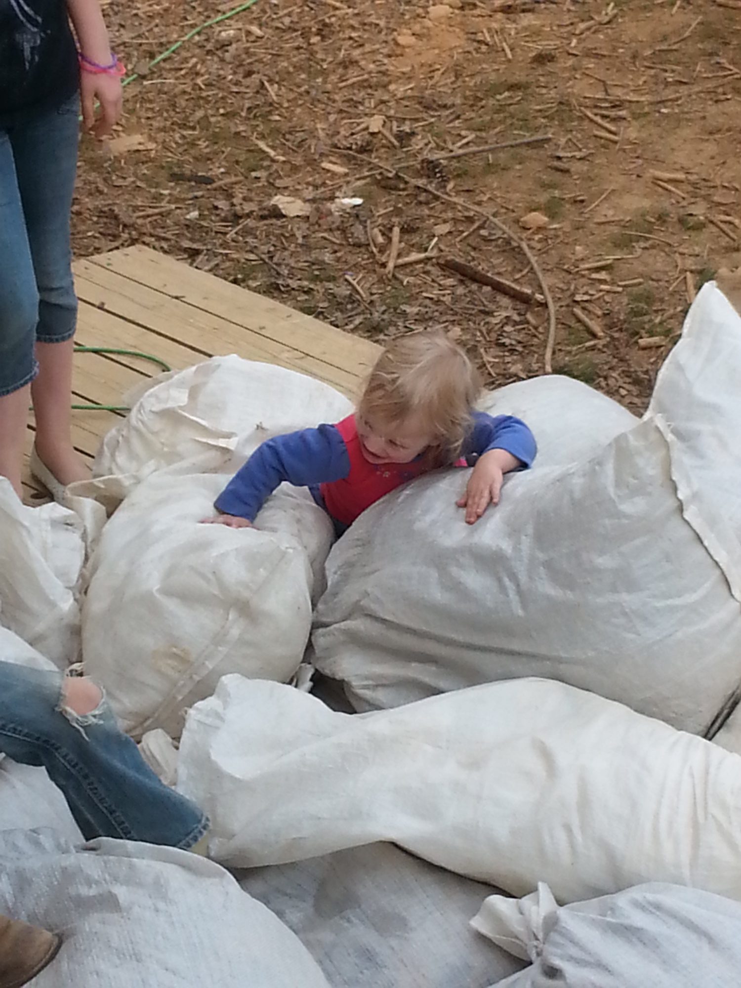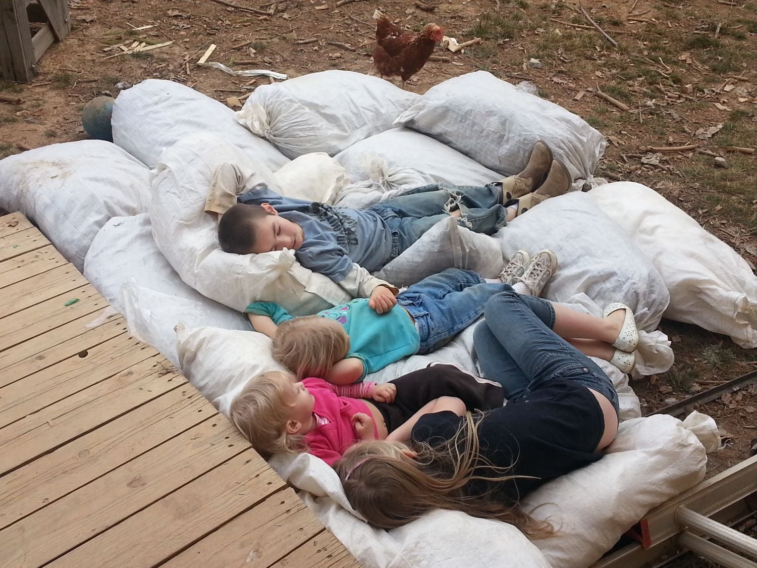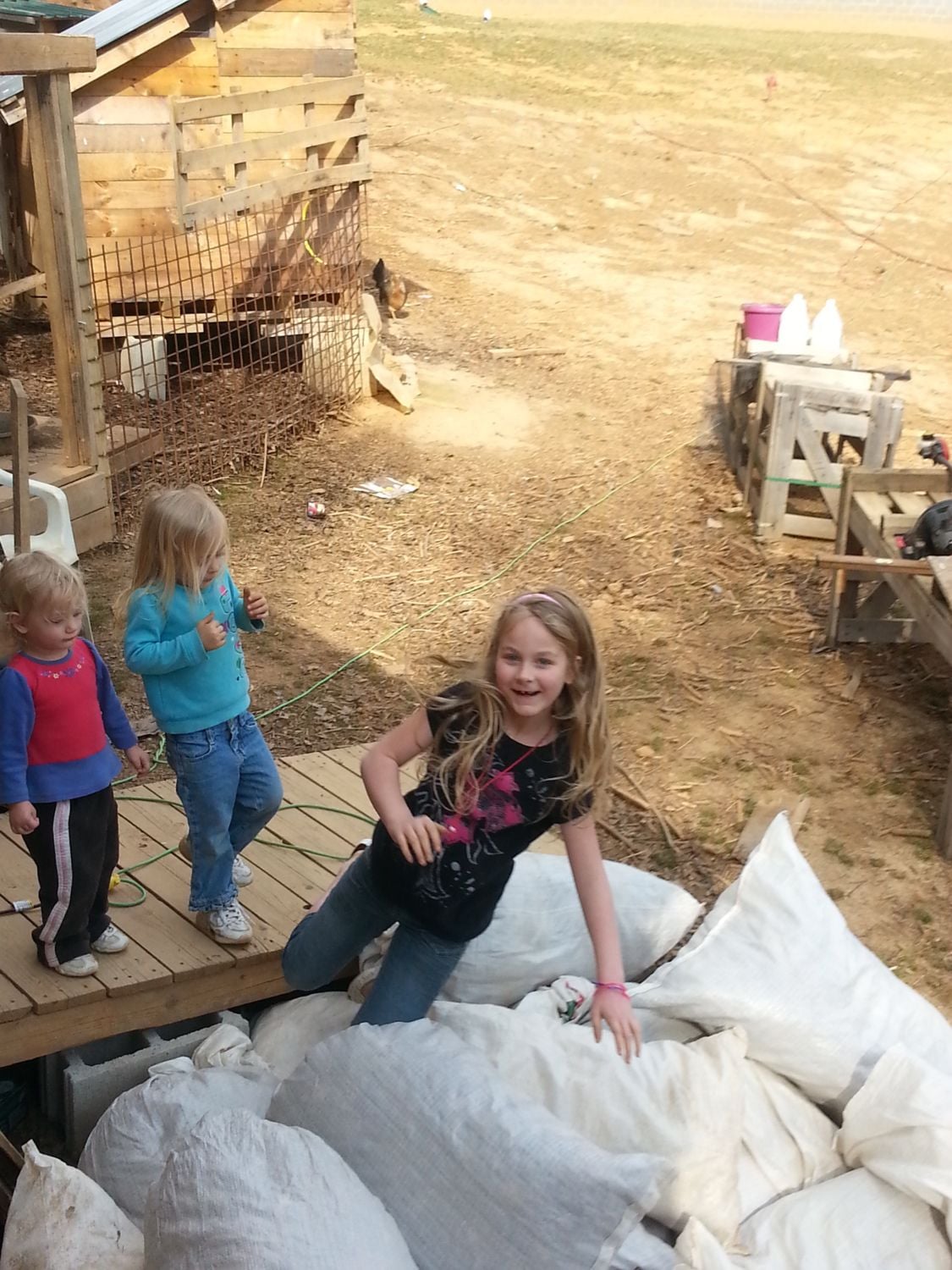What you building and what's in the sacks? lolBoy you all have left me behind today! I'm on page 197, but I can't keep my eyes open to keep reading... We worked on the new coop all day, and let the kids play outside all day...They had a blast jumping on a pile of feed sacks filled with leaves! Temps in the 60s today, and expecting snow and sleet tomorrow! Here's a few pics from my day! Oh, and the girls laid another 14 eggs today!