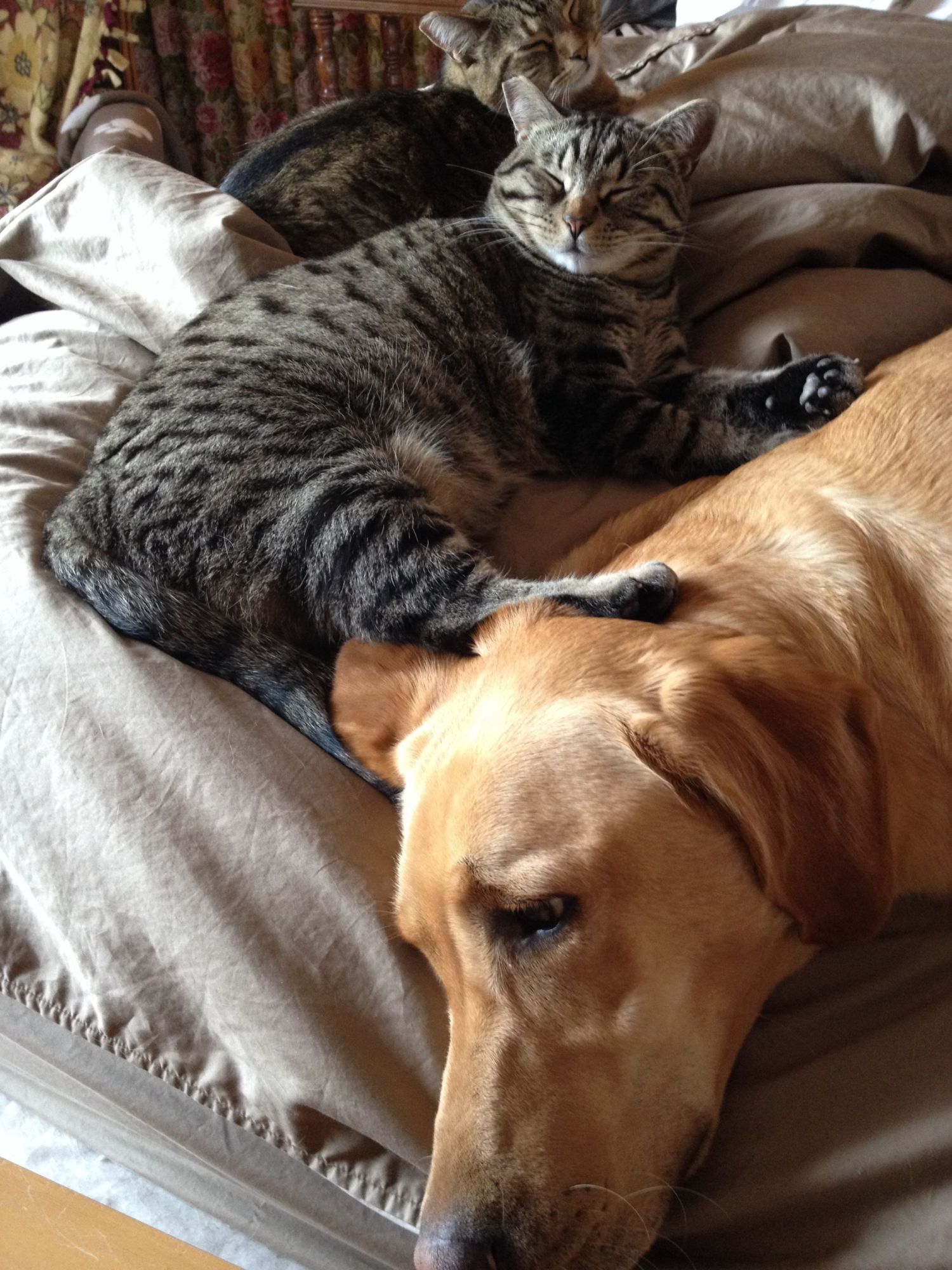 Does he look lonely there in my spot on the bed. Playing possum when I say "scoot!"?